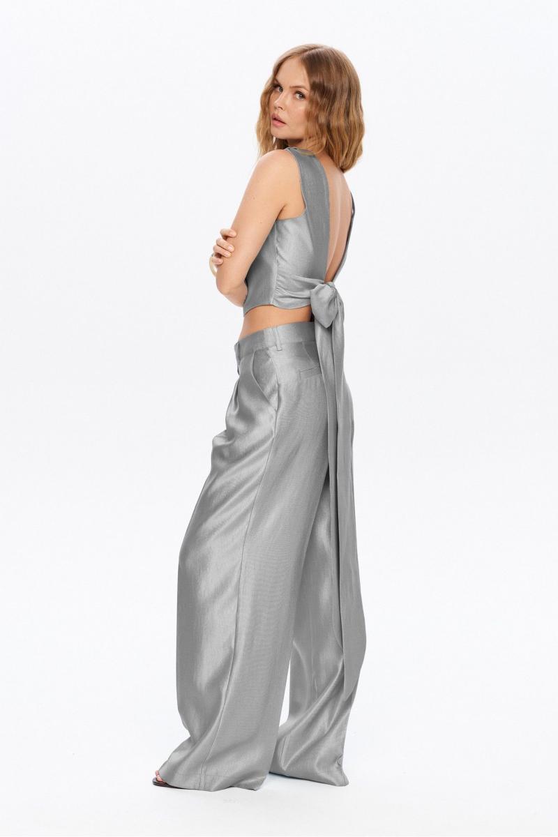 Костюм-двойка из топа с открытой спинкой и брюк-палаццо. Детали: полуприлегающий силуэт, вырез переда- «качели», топ на подкладке, при помощи поясов можно регулировать прилегание. Также пояса можно завязать спереди. Брюки с притачным поясом со шлевками, складки у пояса, застежка на молнию и пуговицу, боковые карманы. Задние части брюк с вытачками и имитацией карманов. Длина топа по спинке около 42 см в размерах 40-46 и около 43,5 см в размерах 48-52. Длина брюк по боковому шву с поясом около 109 см, длина по внутреннему шву около 82 см