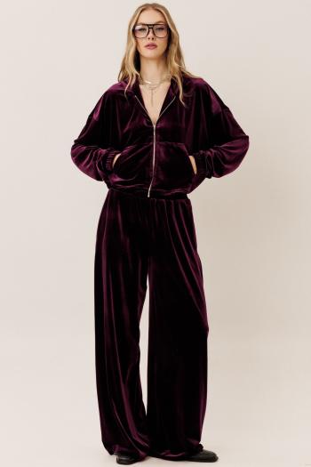 Женский комплект двойка, состоящий из рубашки и брюк «палаццо». Рубашка выполнена из струящегося крепа. Брюки выполнены из ткани костюмно-плательного ассортимента. Рубашка свободного силуэта с центральной бортовой застежкой на петли и пуговицы. Воротник рубашечного типа. Покрой рукава «летучая мышь». По низу рукава есть узкая манжета, а по линии притачивания рукава к манжете есть сборка. Спинка немного длиннее переда. Брюки на притачном пояса, в который на участке бокового шва вставлена эластичная тесьма. Есть застежка с гульфиком на тесьму-молнию. Также по переду есть карманы с клин-подзором. Брюки имеют активно расширенный к низу силуэт.