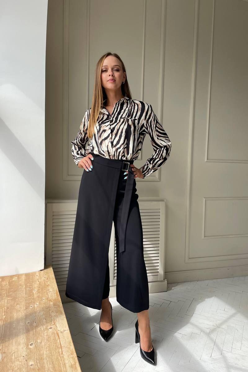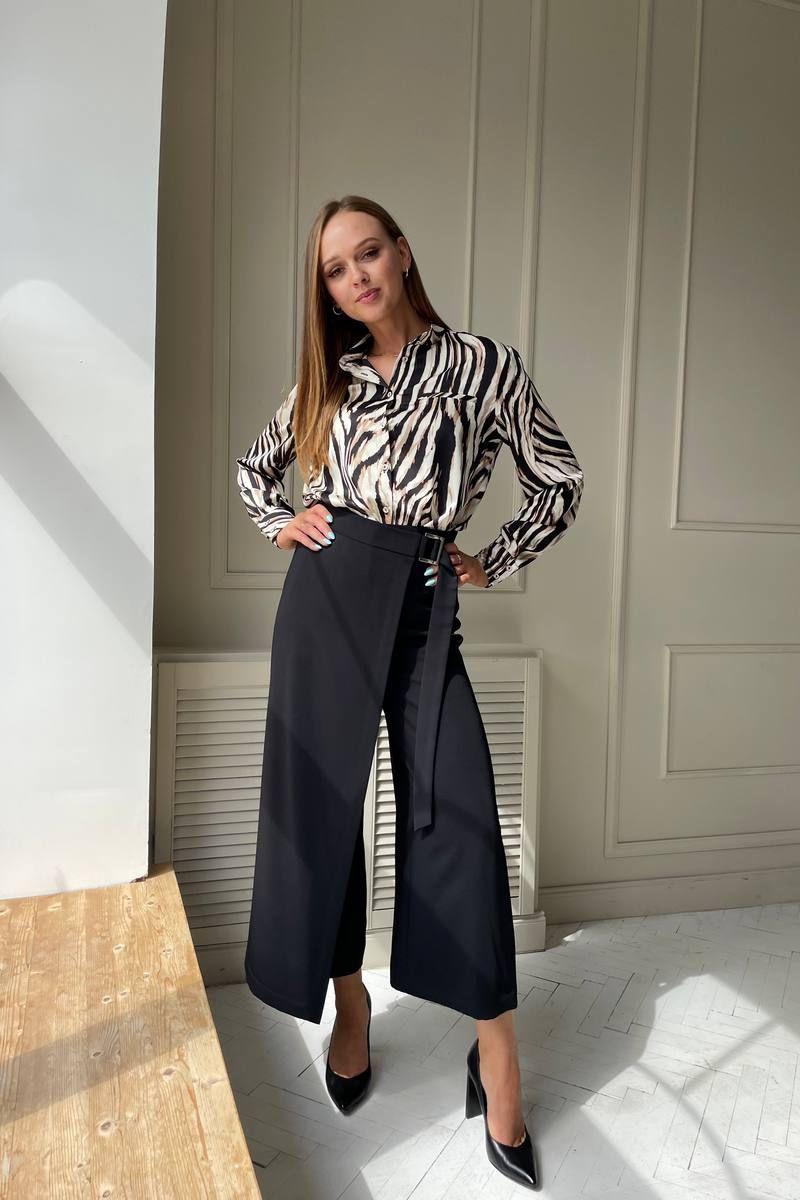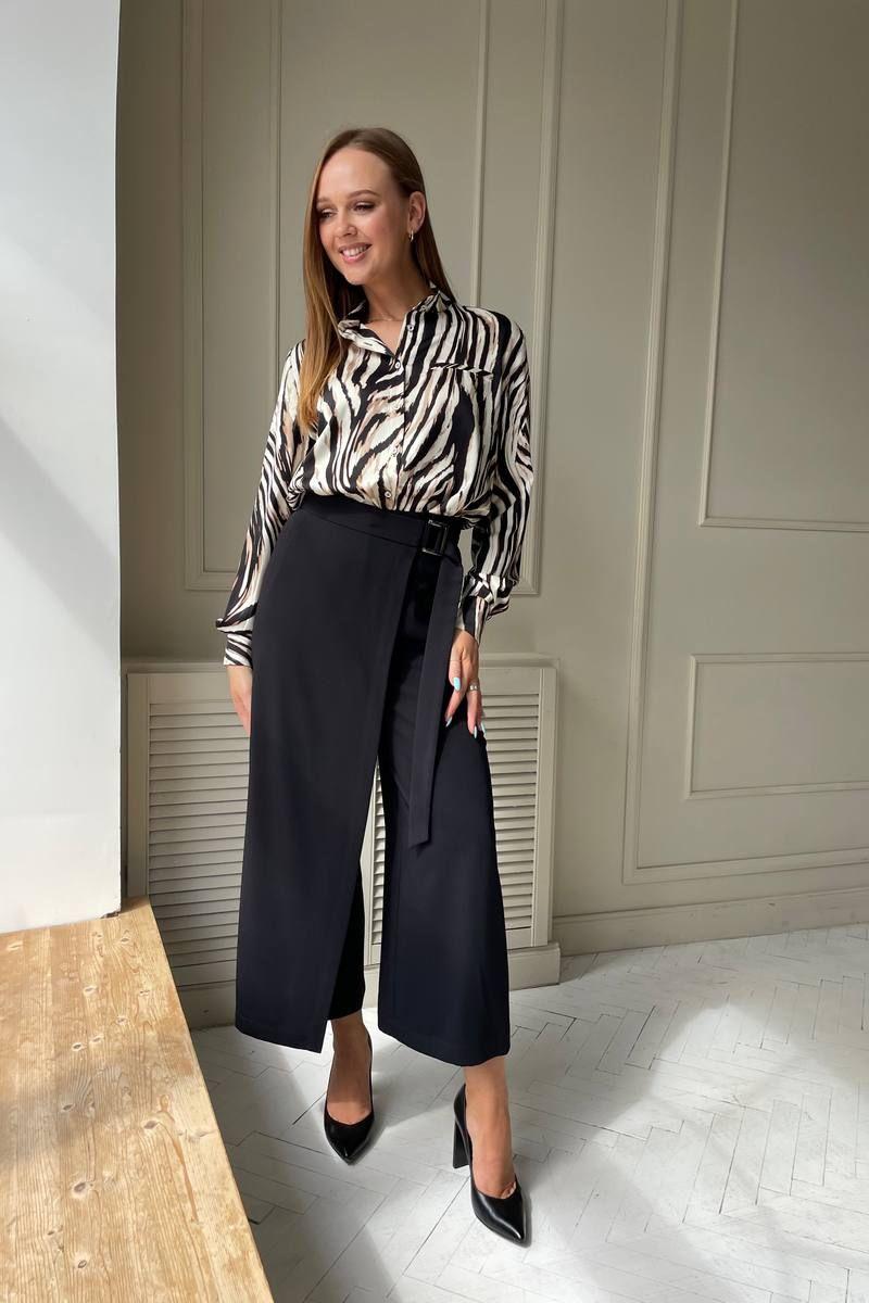 Комплект двойка: блузка и брюки-кюлоты. Блухка прямого кроя, застегивается на пуговицы, из шифона,длина 67 см, рукав 62 см. Стильные брюки на запах, длина 91 см. По верху брюки на притачном поясе с центральной застежкой на молнию. Правая брючина формирует запах с застежкой на полукольца. В боковых швах карманы.