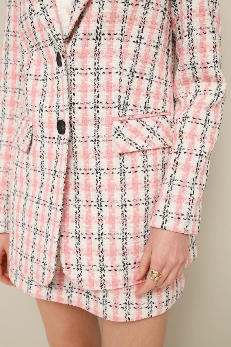 Стильный 2-предметный комплект, состоящий из жакета и юбки-шорт, выполненный из твидовой ткани в клетку. Жакет полуприлегающего силуэта, однобортный, с застежкой на петли и пуговицы. Воротник пиджачного типа с отложными лацканами. Спереди обработаны карманы с клапанами. Рукава втачные двухшовные. Спинка со средним швом. Жакет на подкладке. Юбка-шорты в длине мини, на обтачке по поясу спереди и с притачным поясом по спинке. Застежка на пуговицу и потайную тесьму-молнию в среднем шве спинки.