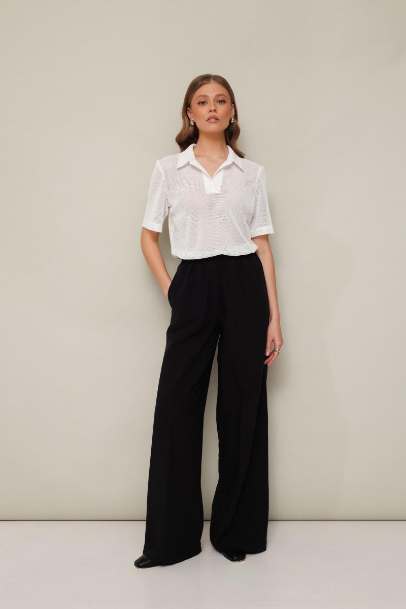 Стильный 2-х предметный комплект, состоящий из поло и брюк. Поло с отложным воротником с цельнокроеной стойкой, V-образный вырез горловины обработан притачными планками. Короткие втачные рукава. Брюки прямого силуэта с боковыми наклонными карманами, спереди обработана имитация гульфика. Пояс притачной на резинке, для регуляции размера.