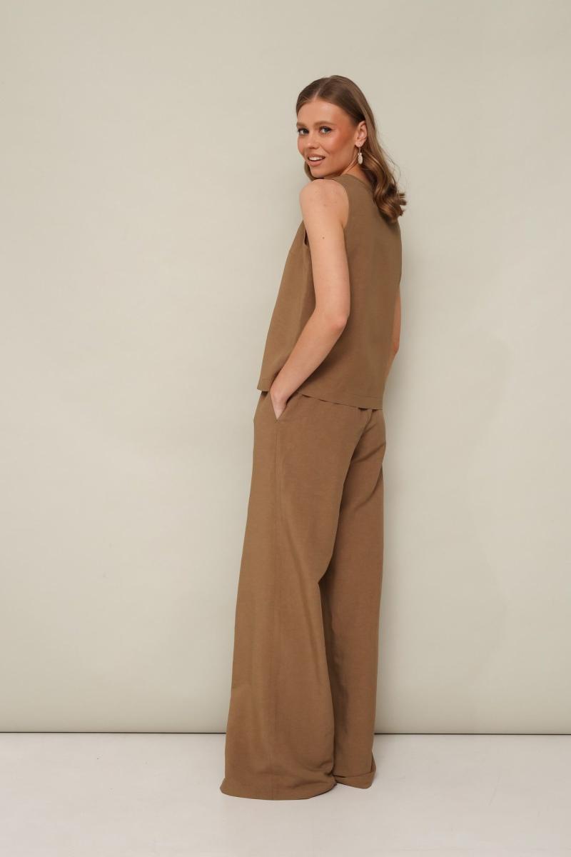 Расслабленный 2-предметный комплект актуального кроя, состоящий из топа и брюк. Топ прямого силуэта, в боковых швах по низу обработаны разрезы. Брюки с притачным, отстроченным поясом на резинке и с боковыми наклонными карманами. Спереди брюк - имитация гульфика.