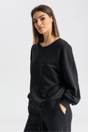 Костюм: джемпер+брюки. Джемпер свободного кроя с округлой горловиной, низ изделия на манжете. Рукав длинный расширеный к низу, заканчивается манжетом. По передней полочке авторская вышивка . Брюки палаццо. Пояс широкий на резинке со стяжкой из хлопкового шнура. Карманы с наклонным входом. По переду и спинке застрочен кант. Низ брюк со шлицей.