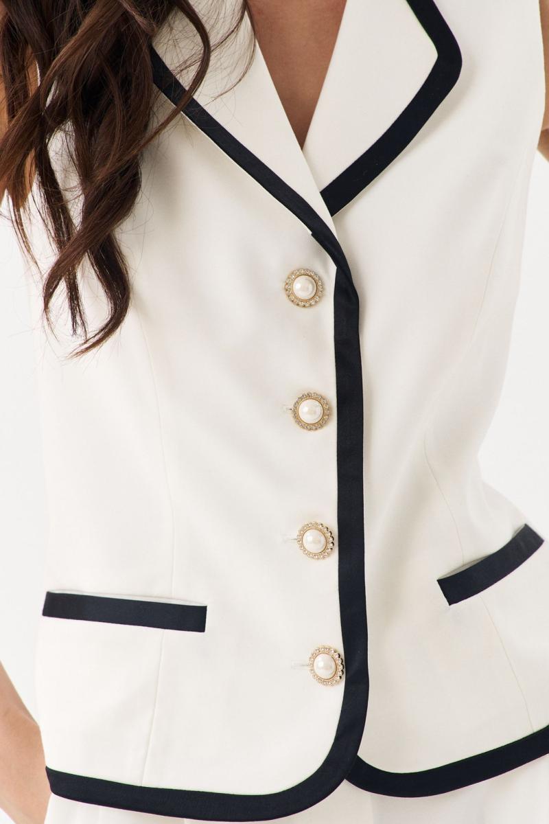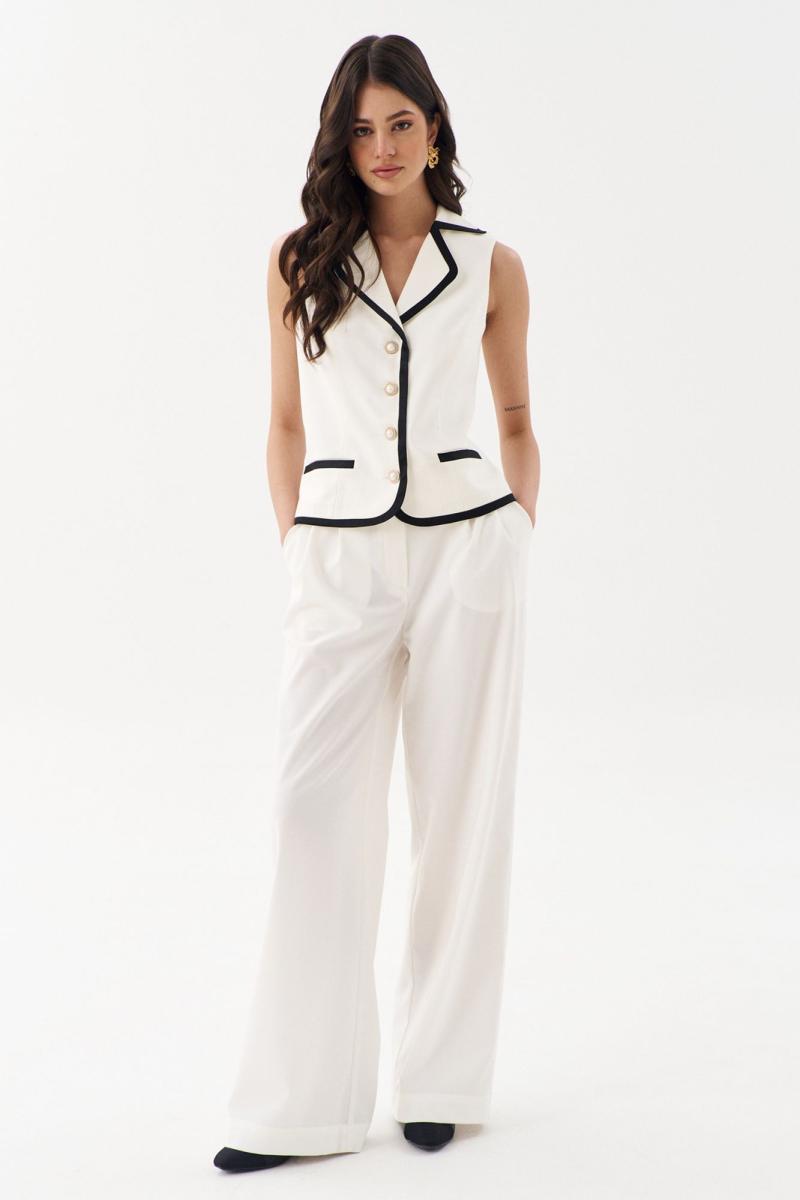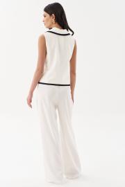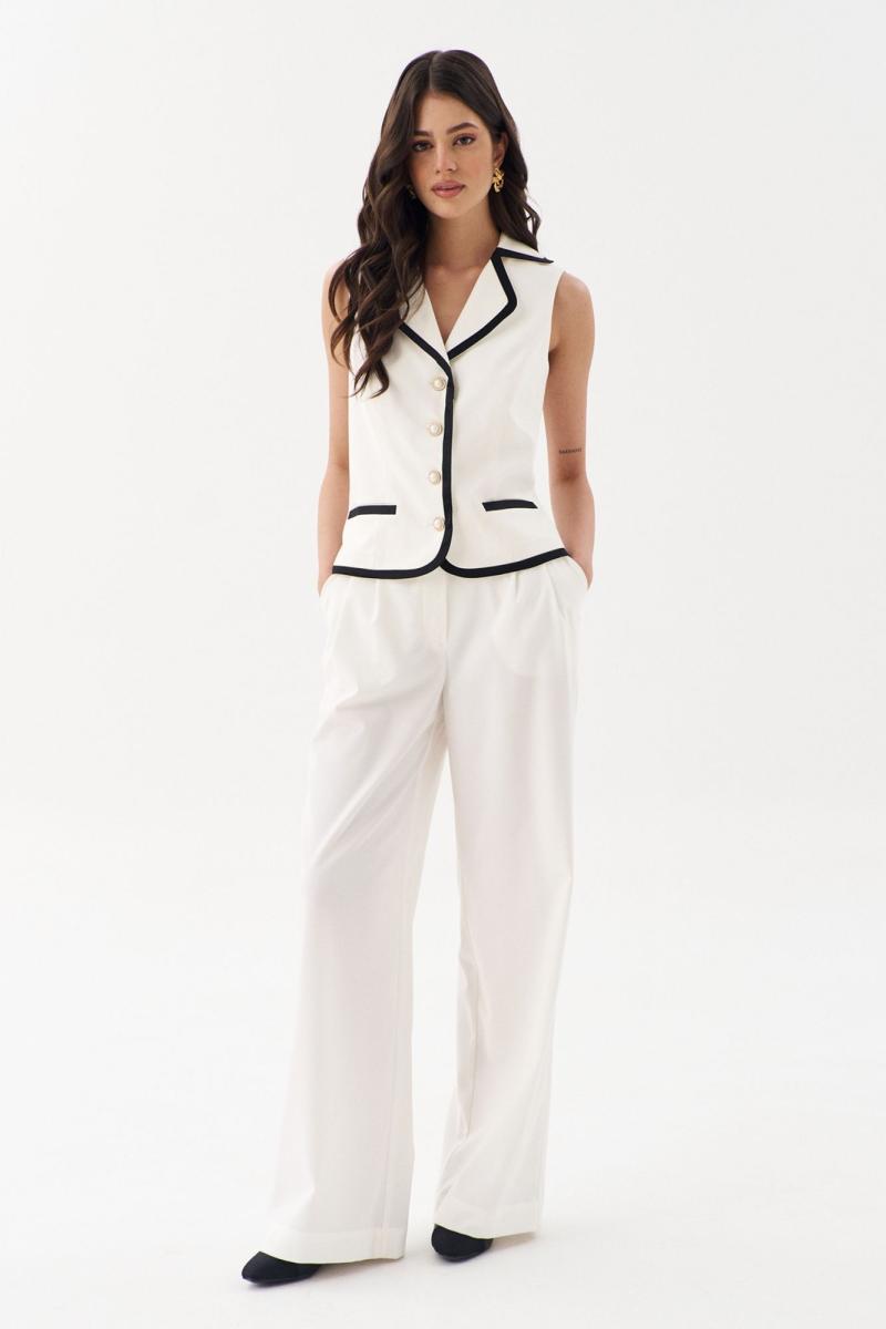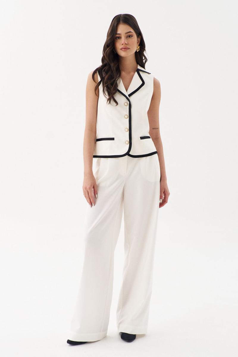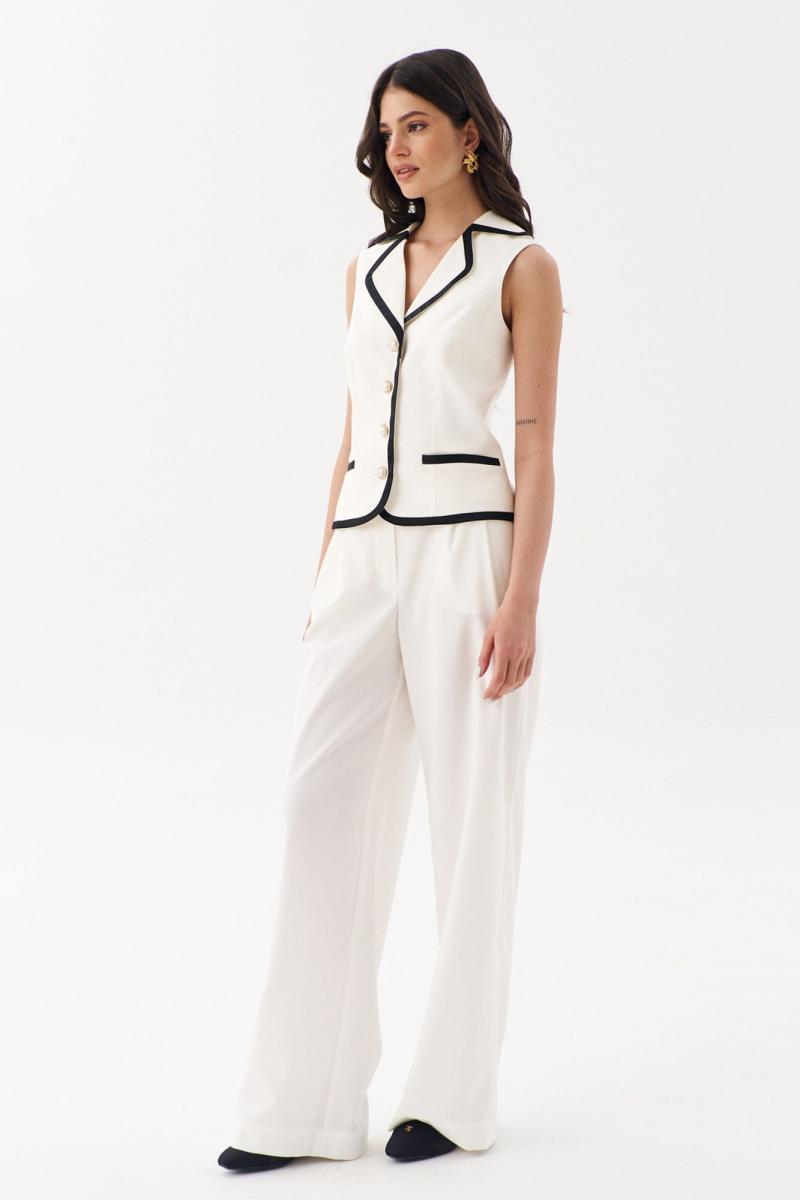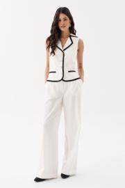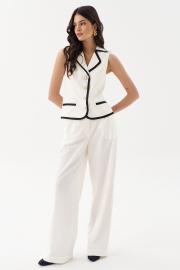 Костюм: жилет+брюки. Жилет полуприлегающего силуэта: •воротник пиджачного типа с лацканами •по воротнику, лацканам и бортам контрастная декоративная отделка •по переду и спинке рельефы •прорезные карманы с листочками •застежка на пуговицы Брюки палаццо: •застежка на гульфик и молнию •по поясу на резинке •в боковых швах карманы