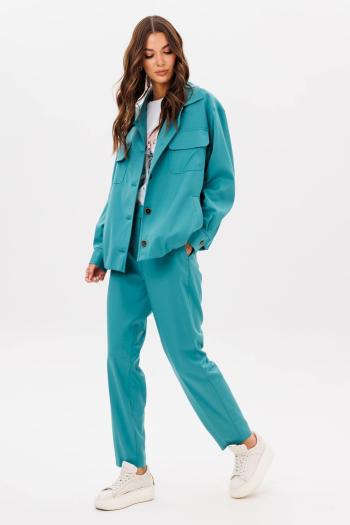 Костюм, состоящий из джемпера и брюк. Джемпер свободного кроя, со спущенной линией плеча, с длинным рукавом. Горловина округлой формы. Горловина, низ изделия и низ рукава обработаны отделочной тканью (кашкорсе). По переду выполнена авторская вышивка. Брюки палаццо на притачном поясе с резинкой, в который вставлен шнур с декоративными наконечниками. В боковых обработаны карманы с наклонным входом. По задним и передним половинам застрочены стрелки. В области низа, по боковым обработаны шлицы.