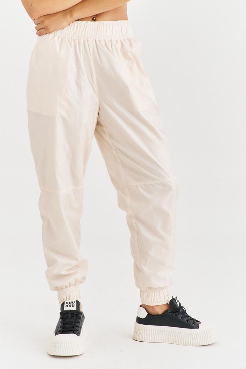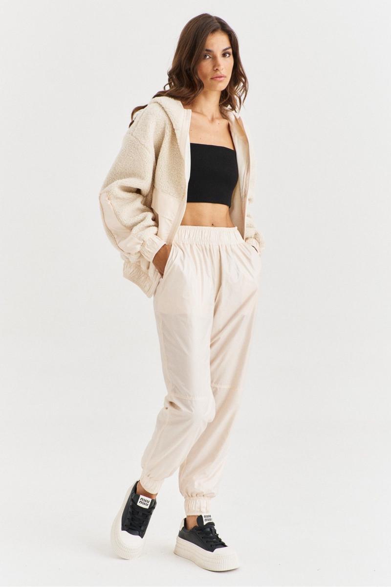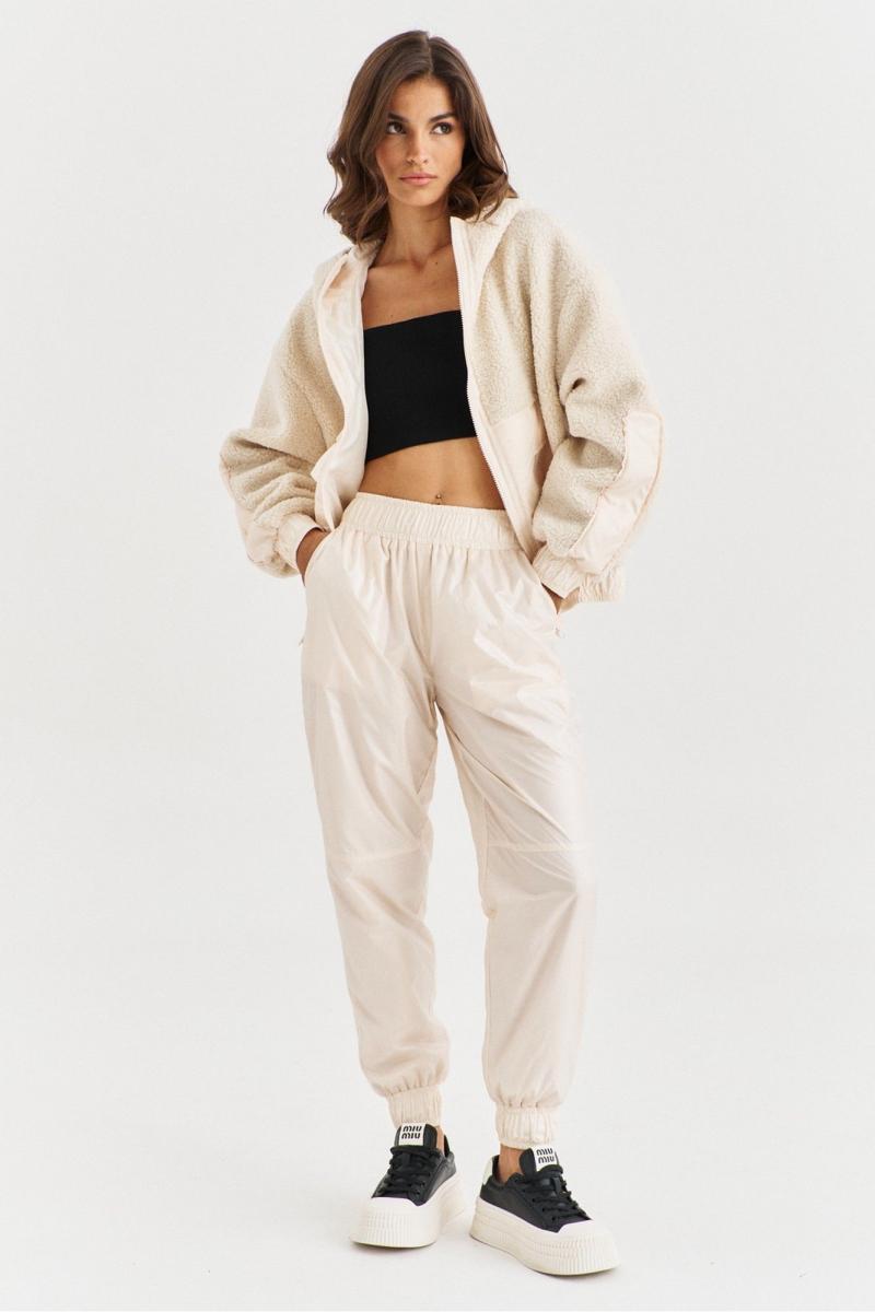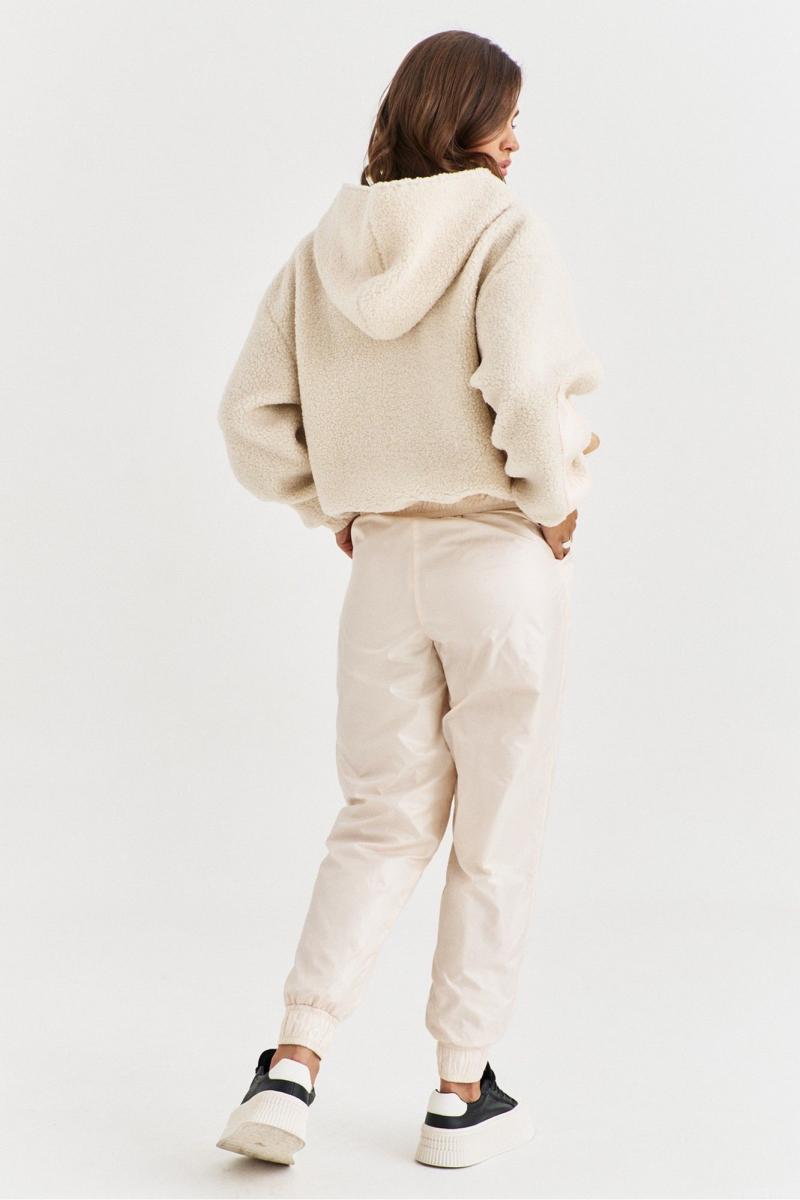 Костюм, состоящий из куртки и брюк. Куртка свободного кроя, длиной чуть выше линии бедер, по низу на притачном поясе с резинкой. Перед с накладными карманами «кенгуру», с притачной планкой по центру. Линия плеча спущена, рукава одношовные, втачные, длинные. По рукаву настрочена декоративная деталь. По низу рукава притачная манжета, в которую вставлена резинка. По горловине капюшон с цельнокроеной стойкой. Застежка по переду на декоративную тесьму-«молнию». Брюки на подкладке, длиной до щиколотки. На передних половинах шов выше колена. В боковых обработаны карманы с наклонным входом. По низу брюк притачная манжета с резинкой. Брюки по талии на притачном поясе с резинкой.