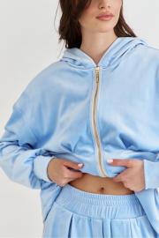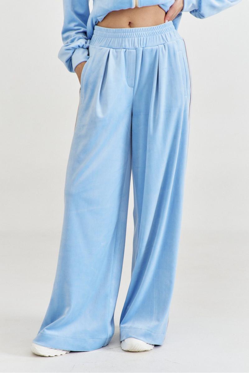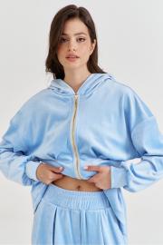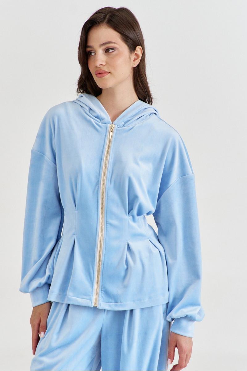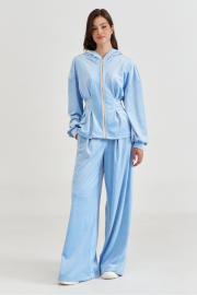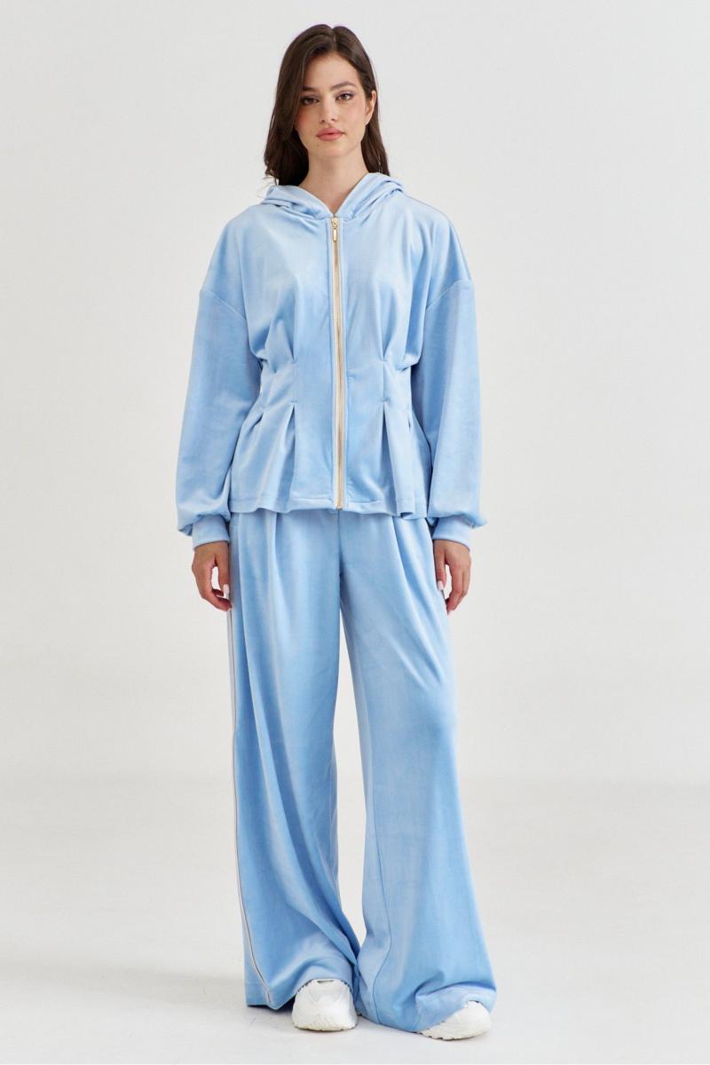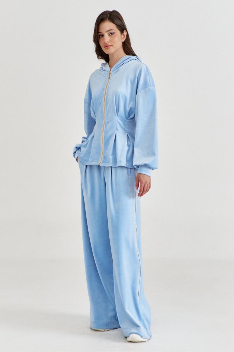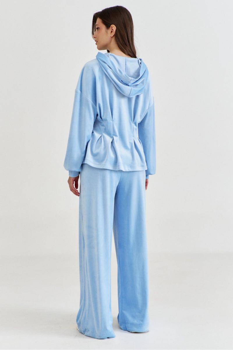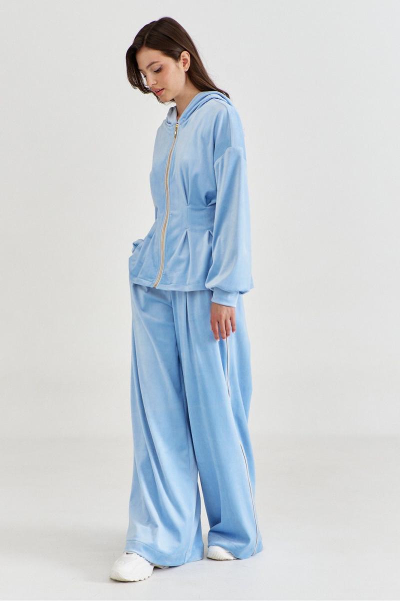 Костюм, состоящий из джемпера и брюк. Джемпер полуприлегающего силуэта, длиной до бедер. Прилегание по талии достигнуто за счет встречных складок. Рукава одношовные, втачные, по низу с притачной манжетой. По горловине вставлен капюшон. По переду застежка на декоративную тесьму-«молнию». По молнии вставлен кант из контрастной ткани. Джемпер без подкладки. Брюки длинные, расширенные к низу, на притачном поясе с резинкой. На передних половинках заложены встречные складки и обработаны карманы с листочкой. В боковые швы вставлен кант из отделочной ткани. Брюки без застежки.