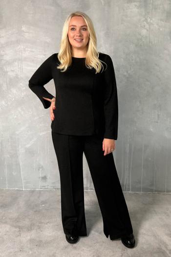 Комплект (блузка и брюки): - блузка полуприлегающего силуэта, длиной до линии бедер. -блузка с притачным поясом по талии из отделочной ткани -линия плеча спущена, рукава одношовные, втачные, длинные -по поясу притачаны шлевки и вставлен пояс -брюки полуприлегающего силуэта, длиной до щиколотки -по переду выполнена застежка на тесьму-«молнию» -на притачном поясе, по спинке которого вставлена резинка.