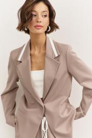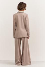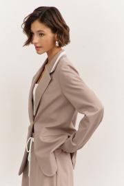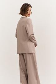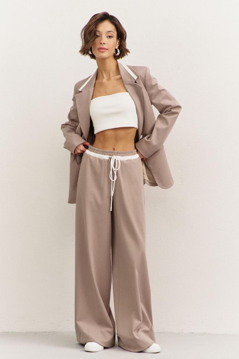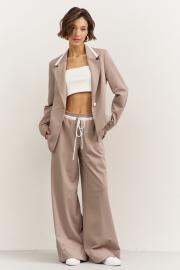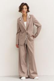 Костюм (жакет+брюки). Жакет полуприлегающего силуэта: • воротник пиджачного типа с лацканами, с декоративным элементом из отделочной ткани • застежка на пуговицу • прорезные карманы с рамкой • рукава втачные, длинные • на подкладке Брюки свободного кроя: • притачной пояс на резинке • по поясу кулиса из отделочной ткани и декоративный шнур • в боковых швах карманы