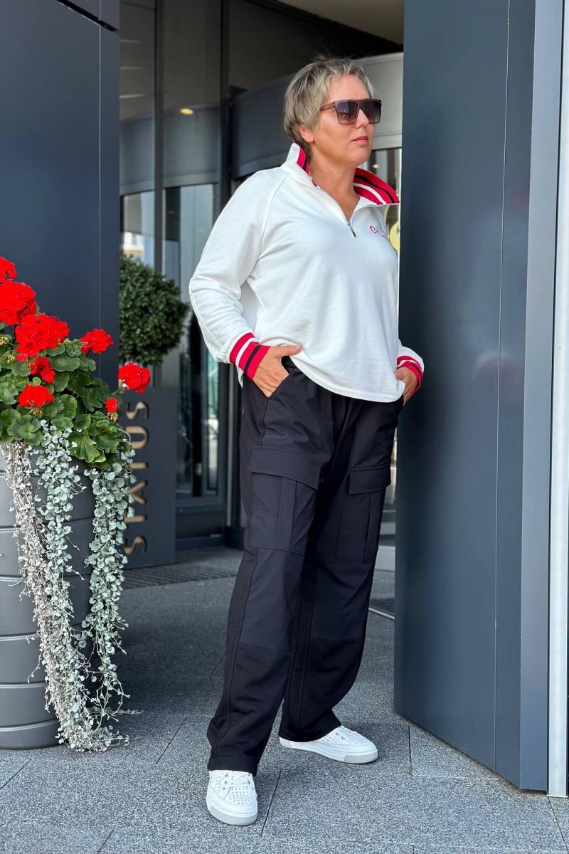 Комплект женский брючный состоит из брюк и блузы. Блуза прямого силуэта с рукавом "реглан", внизу на манжете из тесьмы "довяз". Воротник стойка так же выполнен из этой тесьмы. Застежка по центру переда на молнию, длина 20 см, включая воротник. В левой верхней части переда расположен декор ввиде печати. Брюки прямого силуэта на поясе с резинкой. Передняя половинка выполнена из отделочной ткани с рабочими карманами в верхней боковой части, клапанами и накладными карманами в области нижней части бедра.