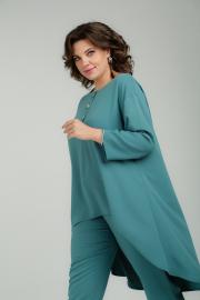 Комплект из облегченной костюмной ткани состоит из туники и брюк. Туника свободного силуэта со спущенной линией плеча и разноуровневой линией низа. Перед в области груди с планкой и застежкой на петли и пуговицы. Рукав втачной одношовный. Вырез горловины типа «лодочка». Длина по спинке 100 Длина рукава 44 Брюки зауженные к низу с карманами в боковых швах, гульфиком с застежкой-«молнией», на поясе с резинкой, с застежкой на петли и пуговицы. Длина 102