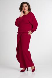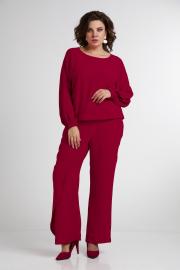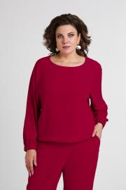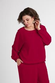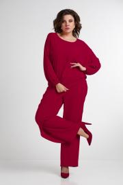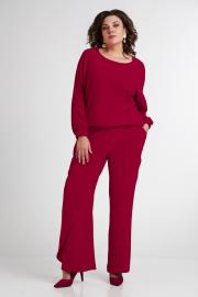 Комплект из облегченной костюмной ткани состоит из блузы и брюк. Блуза свободного силуэта с цельнокроеным рукавом. Низ блузы и рукава с обтачкой на резинке. Вырез горловины круглый. Длина по спинке 63. Длина рукава от горловины 70. Брюки свободного силуэта, с имитацией запаха, с карманами в боковых швах, на поясе с резинкой. Длина 107