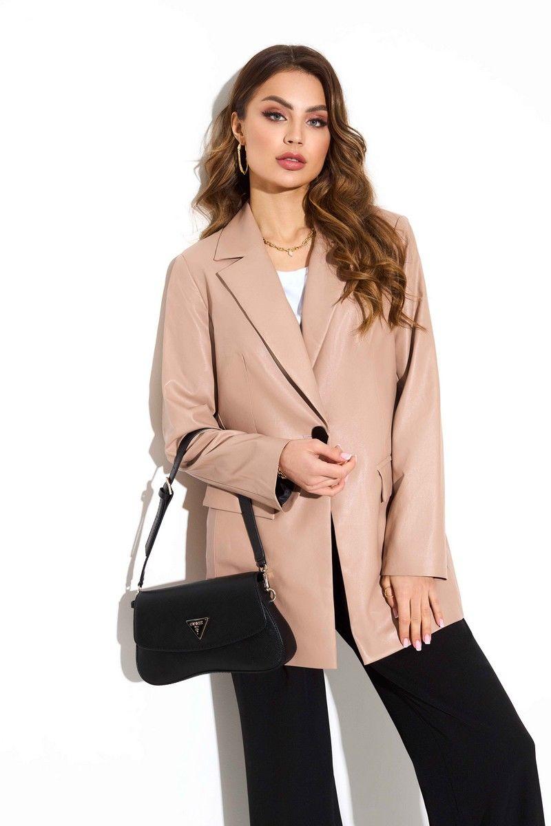 Комплект-двойка из жакета и брюк. Удлиненный кожаный жакет полуприлегающего силуэта с застежкой на одну пуговицу. Втачной рукав, пиджачный воротник, карманы с клапанами. На подкладке. Брюки «палацио» из текстиля: высокая посадка, от пояса заложены складки, застежка на молнию и пуговицу, наклонные карманы по переду и листочка-обманка по спинке. В размерах 56-60 в пояс дополнительно вставлена резинка. Длина жакета 73 Длина рукава 60 Длина брюк 106