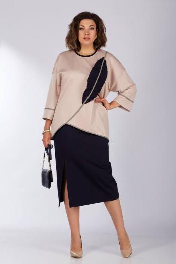 Блуза объёмная, прямого силуэта, с мягкой линией плеча и рукавами в ¾ длины. Низ переда и спинки фигурный, разной длины. Горловина округлая, на спинке обработана короткая металлическая молния. Низ рукавов со складками. Длина по спинке от верхней точки плеча ок. 84 см. в 52-м размере. Длина переда-ок.69 см. Брюки классические, слегка зауженные к низу, с заутюженными стрелками спереди и сзади. На передних половинах обработаны карманы с косым входом, застёжка на молнию и пуговицу. Верх брюк на притачном поясе со шлёвками и эластичной тесьмой . Длина по боковому шву ок 100см в 52м. размере, по внутреннему шву ок 71 см.