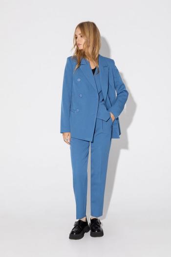 Жакет свободный, с мягкой линией плеча, воротником пиджачного типа с отворотами лацканов и с кокетками на спинке и спереди. В боковых швах обработаны карманы. Длина по спинке ок. 76 см, длина рукава от нормали ок. 64 см. Изделие на подкладке Зауженные к низу брюки с боковыми карманами и передней застёжкой на молнию и пуговицу. Пояс на эластичной тесьме, со шлёвками. Длина по боковому шву с поясом ок.97см, по внутреннему шву ок. 69см.
