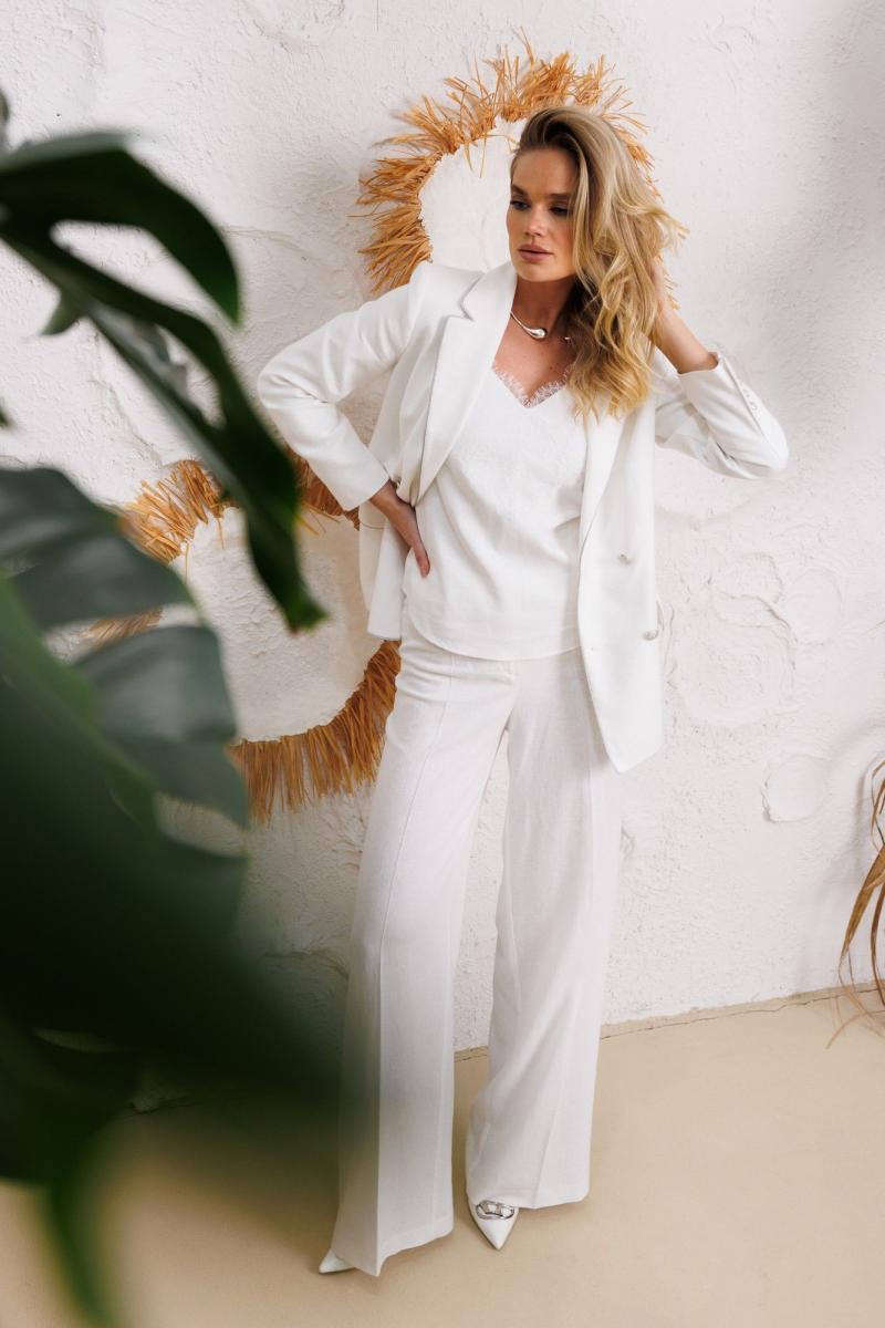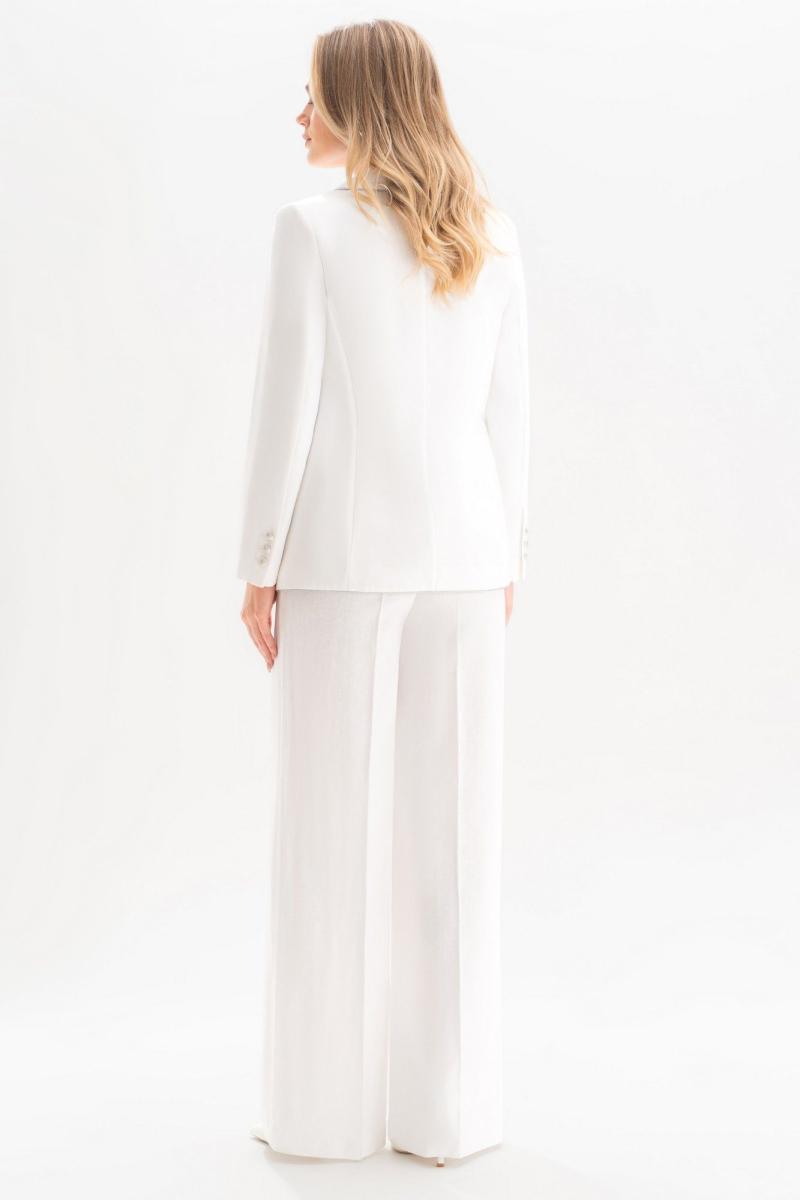 Этот белоснежный женский костюм из льна — идеальный выбор для тех, кто ценит сдержанную роскошь и натуральные ткани. Прямой двубортный жакет украшен изысканным кантом, подчёркивающим линии силуэта и придающим образу благородство. Изящные пуговицы с фактурным блеском дополняют стильный образ. Свободные брюки с высокой посадкой визуально удлиняют ноги и дарят максимальный комфорт даже в жаркий день. Льняная ткань приятна к телу, дышащая и экологичная — идеальный выбор для весны и лета. Сочетайте костюм с базовым топом и лодочками для делового образа или носите с лёгкой майкой и сандалиями — для расслабленного шика в отпуске. Костюм женский состоит из жакета и брюк, выполненных из костюмной льняной ткани, предназначен как для нарядной так и для повседневной носки. Жакет свободного полуприлегающего силуэта, на подкладке, с двубортной застежкой на 2 петли и 4 металлические пуговицы (размер и цвет фурнитуры может незначительно отличаться от фото). Перед и спинка с отрезным бочком. Перед в нижних частях с прорезными карманами с клапаном и обтачкой, с талиевыми вытачками, с рельефными швами бочка. Клапаны по двум сторонам с отделочным серебристым кантом, концы клапанов слегка закруглены. Спинка со средним швом, с рельефными швами бочка. Рукава втачные, двухшовные, длинные. В локтевом шве по низу с отлетной шлицей с 3-мя петлями и 3-мя пуговицами. Горловина оформлена воротником пиджачного типа. Концы воротника и лацкана закругленные. Воротник, лацканы, борта, низ переда и спинки обработан отделочным серебристым кантом. Жакет с плечевыми накладками. Брюки женские прямые от бедра, в размерах 42,44,46,48 на обтачном поясе, в размерах 50,52 с притачным поясом, с резинками на уровне боковых швов. По поясам с 5-ю шлевками, с застежкой на тесьму - «молнию», расположенную в среднем шве передних половинок. Пояс застегивается спереди на 1 пришивной потайной крючок, 1 петлю и 1 потайную пуговицу (размер и цвет фурнитуры может незначительно отличаться от фото). Задние половинки брюк с талиевыми вытачками, идущих от пояса вниз. Брюки с заутюженными стрелками по передним и задним половинкам.