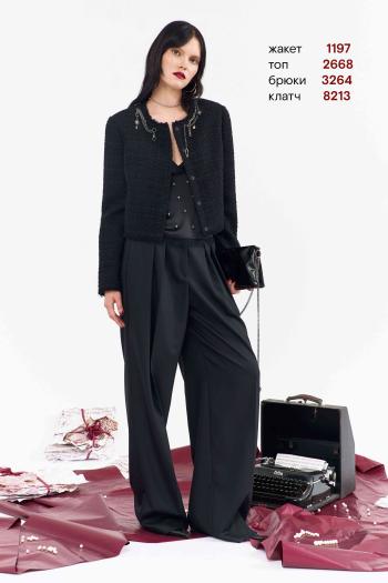 Брюки прямые. Верх на поясе со шлевками. В пояс по спинке вставлена резинка. Застежка по переду на молнию и пуговицу. В боковых швах карманы. Брюки на подкладке.