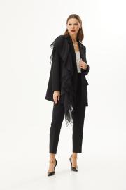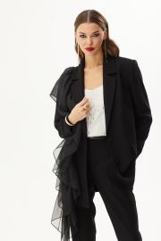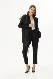 Жакет прямого силуэта. Застежка на петли и пуговицы. Воротник пиджачного типа. На переде карманы с клапаном. На правой полочке декоративная оборка. Рукав прямой двухшовный. Жакет на подкладке.