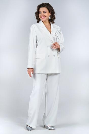 Костюм женский, состоит из туники и брюк. Туника свободного силуэта, с покроем рукава типа "летучая мышь". Застежка в среднем шве спинки на потайную тесьму-молнию. Горловина округлой формы. Низ разно-уровневый. В боковых швах выполнены разрезы. Рукав длинной 3/4, " и манжетой "на запах". Перед и спинка выполнены с декоративными рельефами и втачным кантом. Боковые части спинки и переда выполнены из отделочной ткани контрастного цвета. Брюки Прямого силуэта, с центральной застёжкой на молнию и петлю-пуговицу. В боковых швах карманы. Пояс притачной с резинкой по бокам.