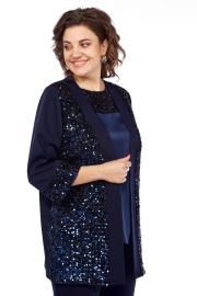 Комплект женский состоит из жакета, топа и брюк. Жакет свободного покроя с естественной линией плеча. Рукав втачной одношовный длиной 3/4 с манжетой из отделочной ткани "пайетки". Перед выполнен из отделочной ткани "пайетки" на атласной подкладке. Обработаны отрезные планки. Топ свободного покроя из атласной ткани. Горловина округлой формы. По переду обработана кокетка из отделочной ткани "пайетки". Рукав спущенный цельнокроеный. Брюки прямые, с центральной застёжкой на молнию и петлю-пуговицу. В боковых швах карманы. Пояс притачной с резинкой по бокам.