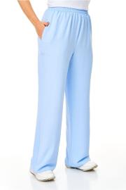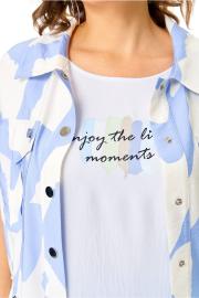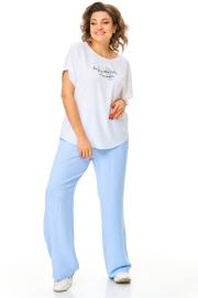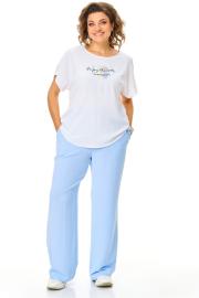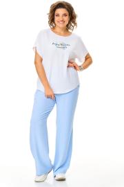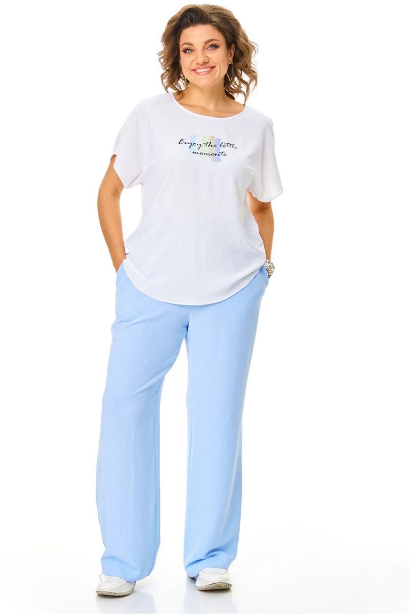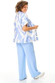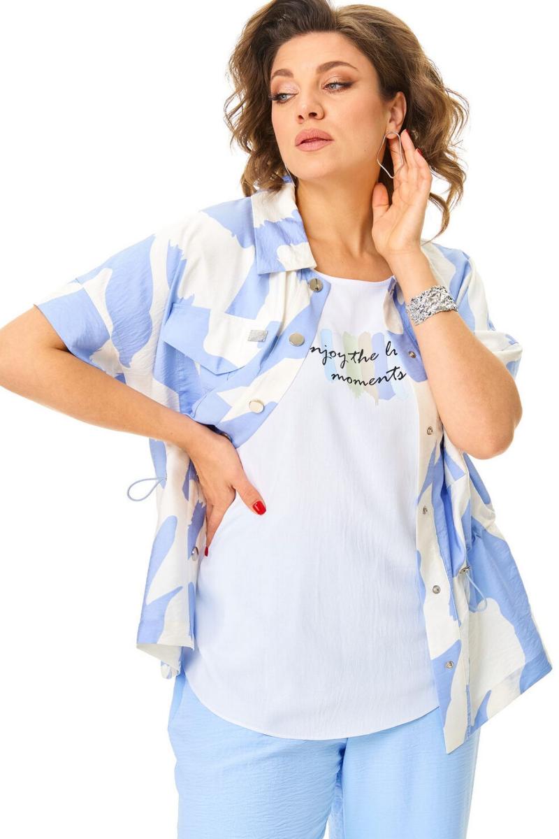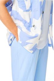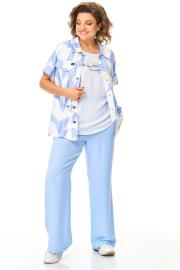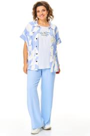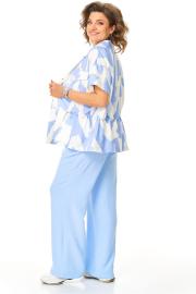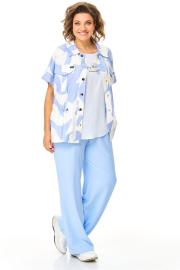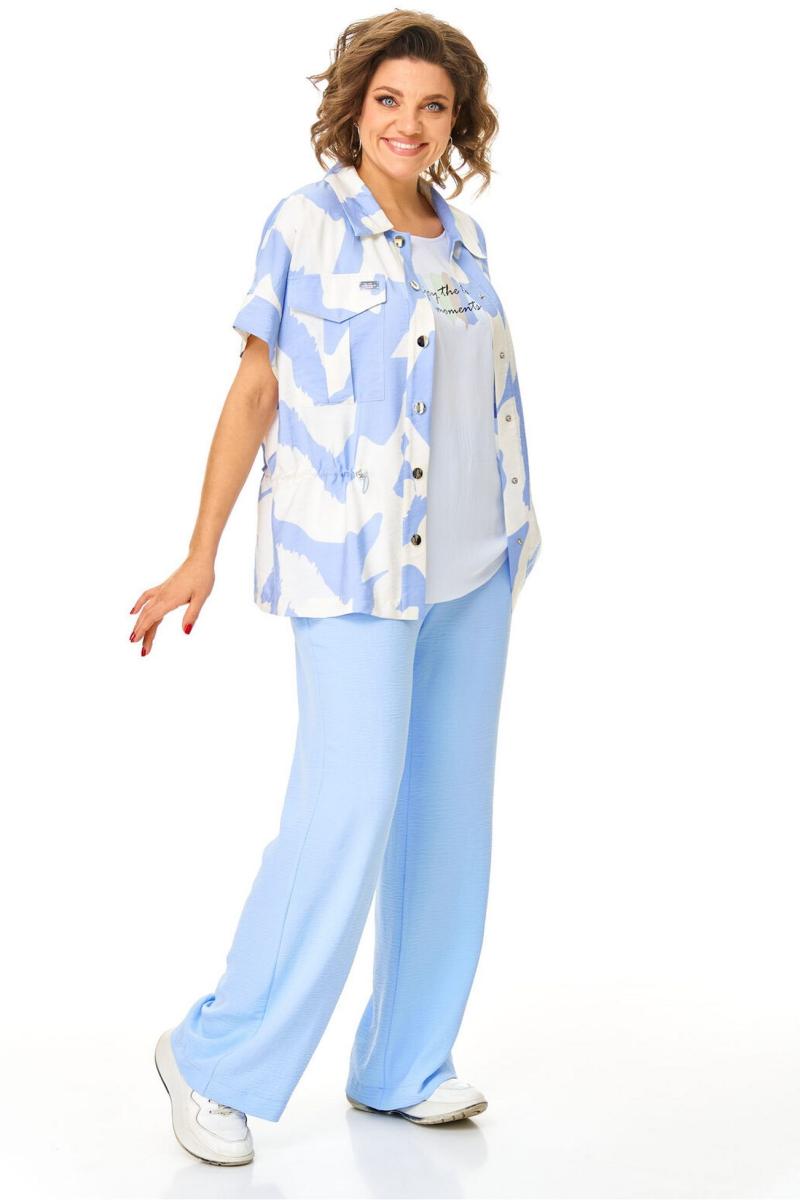 Комплект женский состоит из блузы, топа и брюк. Блуза прямого свободного покроя со спущенной линией плеча.По переду обработана планка.Застежка центральная бортовая на золотые кнопки.По спинке и переду обработана кулиса со втянутой шляпной резинкой и золотыми фиксаторами.Воротник блузочный отложной.Низ рукава обработан притачной планкой.По переду имеются накладные карманы с бантовыми складками и клапанами.На одной из клапанов имеется декоративная золотая нашивка.Топ свободного покроя со спущенной линией плеча.Горловина округлой формы.Низ фигурный.На переде имеется принт.Брюки свободные прямого силуэта.Пояс притачной на резинке.В боковых швах карманы.