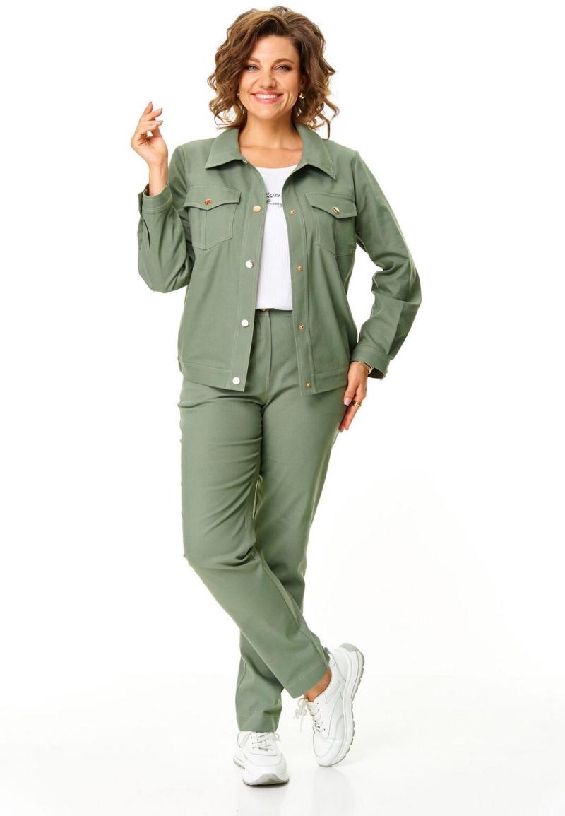Костюм женский состоит из жакета и брюк. Жакет свободного силуэта с естественной линией плеча.Перед с отрезной планкой и центральной бортовой застежкой на золотые кнопки.По спинке выполнены кокетка и рельефы.По переду имеются накладные карманы авторской формы с клапанами.В боковых швах карманы.Воротник отложной.Рукав длинный с защипами по низу и патой.Низ рукава обработан притачной манжетой с застежкой на золотую кнопку.Низ жакета обработан притачным поясом с резинкой по спинке и некоторой части переда.Брюки зауженные к низу, с центральной застёжкой на молнию и петлю-пуговицу.В боковых швах карманы с отрезным бочком.Пояс притачной с резинкой по бокам.Отделочные строчки контрастного цвета.Вся фурнитура металлическая premium качества.