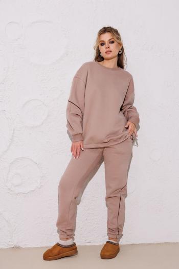 Комплект женский состоит из жакета и брюк. Жакет прямого свободного покроя со спущенной линией плеча.Застежка двубортная на золотые пуговицы.Воротник отложной пиджачного типа. Рукав длинный с отделочной нашивкой.По переду обработаны прорезные карманы с листочкой.Спинка со средним швом.Брюки свободного силуэта типа "палаццо" с защипами на передних половинкахЗастёжкой на молнию и петли-пуговицы.В боковых швах карманы с отрезным бочком.Пояс притачной с резинками по бокам.Отделочные строчки контрастного цвета.Вся фурнитура металлическая premium качества.