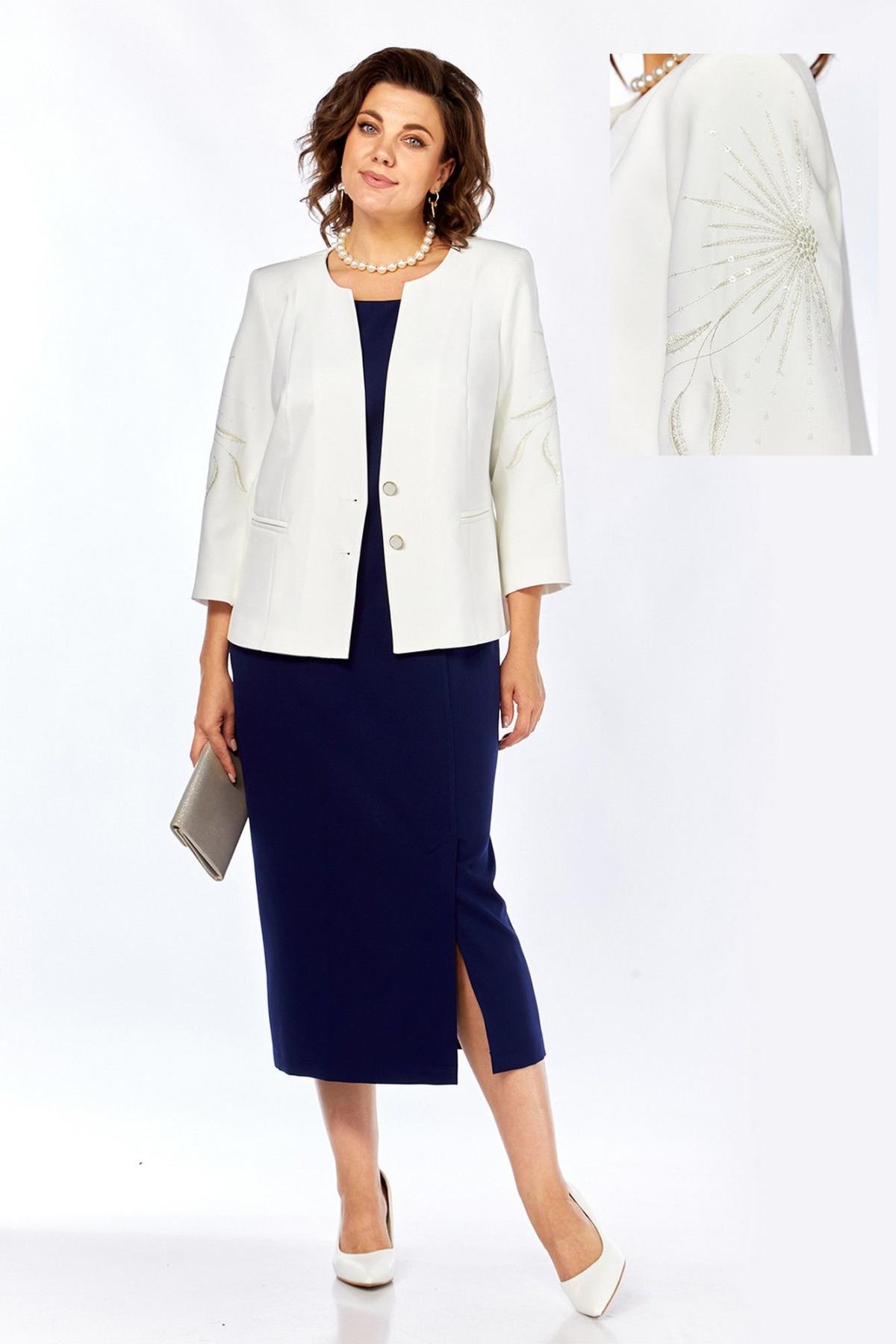 Костюм женский нарядный, прямого силуэта, состоит из жакета и платья. Жакет с фигурным вырезом застежка центрально-бортовая на две петли и пуговицы. По переду обработаны рельефы от плечевого шва и прорезные карманы. По спинке средний шов и плечевые вытачки. Рукава втачные, длиной ⅞ дополнены дизайнерской вышивкой. Жакет на подкладке. Платье выполнено из костюмно-плательной ткани. Горловина округлой формы, обработана обтачкой. По спинке средний шов, с фигурным вырезом, у горловины застежка на навесную петлю и пуговицу. По переду обработан рельеф со шлицей по низу. Рукава втачные с разрезами. Длина жакета по спинке — 61 см, длина плеча — 11 см, длина рукава — 49 см. р.52 — ПОГ 56 см ПОБ 59 см, р.54 — ПОГ 58 см ПОБ 61 см, р.56 — ПОГ 60 см ПОБ 63 см. Длина платья по спинке — 120 см, длина рукава — 30 см. р.52 — ПОГ 56 см ПОБ 64 см, р.54 — ПОГ 58 см ПОБ 60 см, р.56 — ПОГ 60 см ПОБ 62 см.