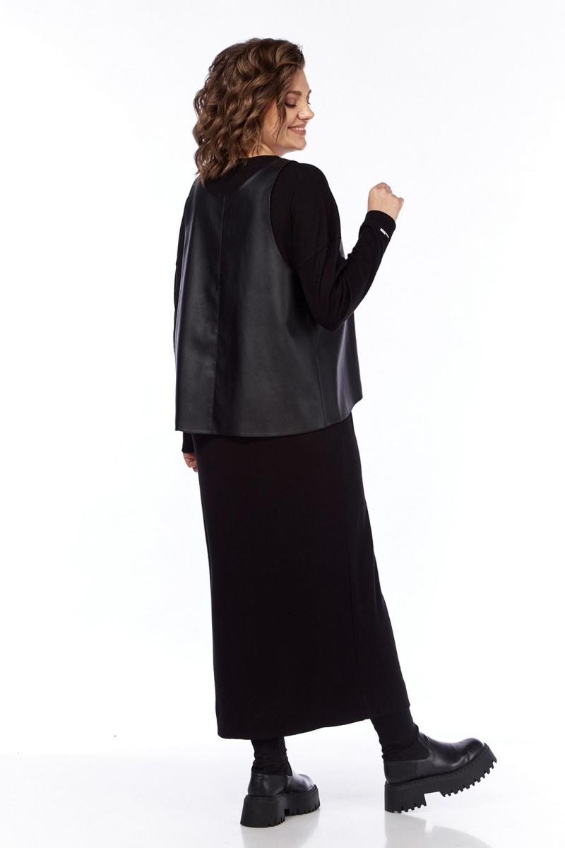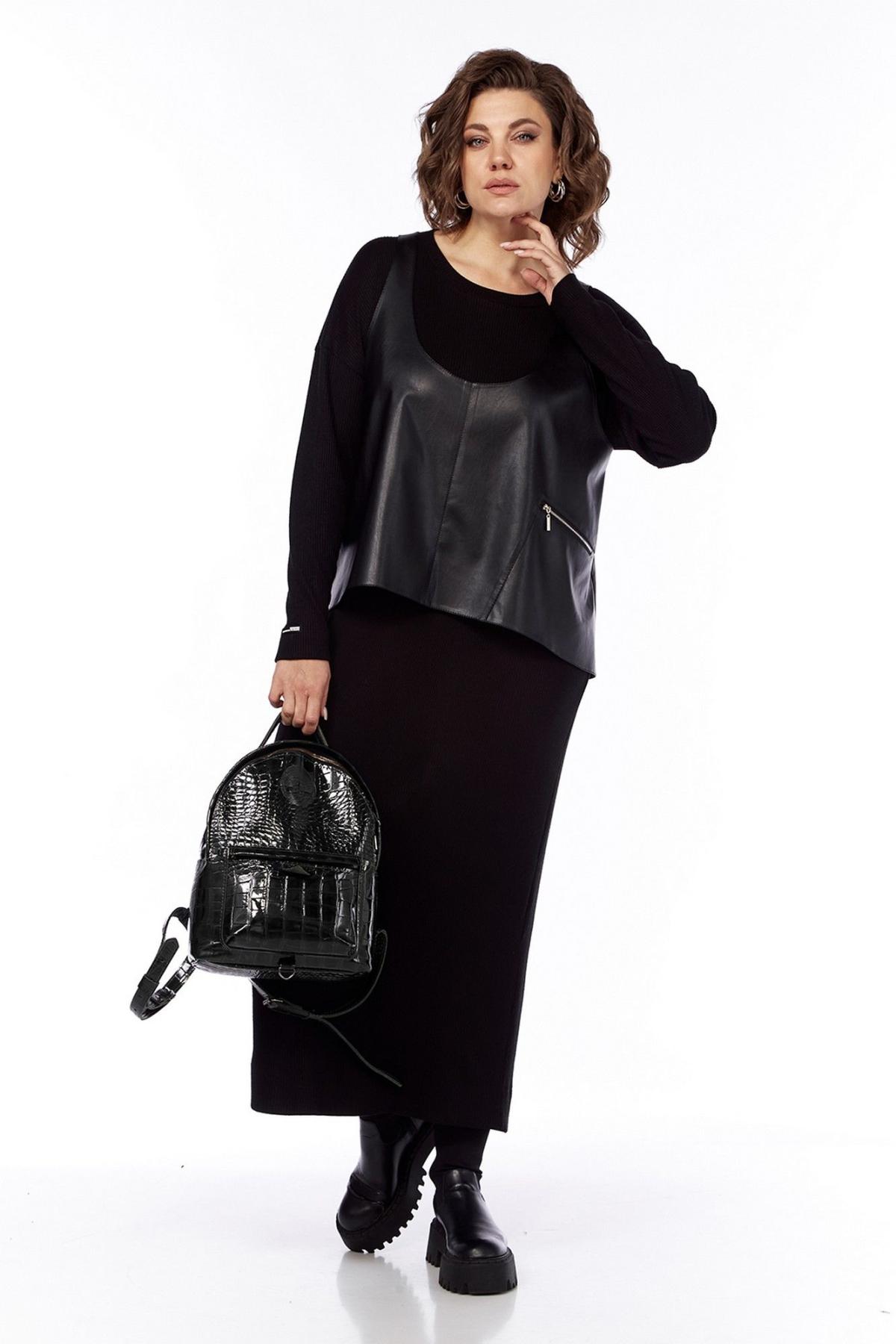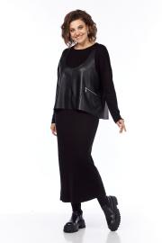 Комплект женский двухпредметный состоит из платья и жилетки. Платье свободного силуэта выполнено из трикотажного полотна ( лапша ). Перед и спинка цельнокроеные. Рукава спущенные. Жилетка выполнена из искусственной кожи на вискозной основе, А — силуэта. Перед со средним швом и асимметричным декоративным элементом. Спинка разрезная по центру. Длина платья по спинке — 127 см, длина плеча + рукав — 73 см. р.50 — ПОГ 51 см ПОБ 54 см, р.52 — ПОГ 53 см ПОБ 56 см, р.54 — ПОГ 55 см ПОБ 58 см, р.56 — ПОГ 57 см ПОБ 60 см. Длина жилетки по спинке — 66 см. р.50 — ПОГ 54 см ПОБ 67 см, р.52 — ПОГ 56 см ПОБ 69 см, р.54 — ПОГ 58 см ПОБ 71 см, р.56 — ПОГ 60 см ПОБ 73 см.
