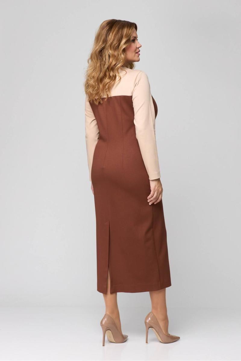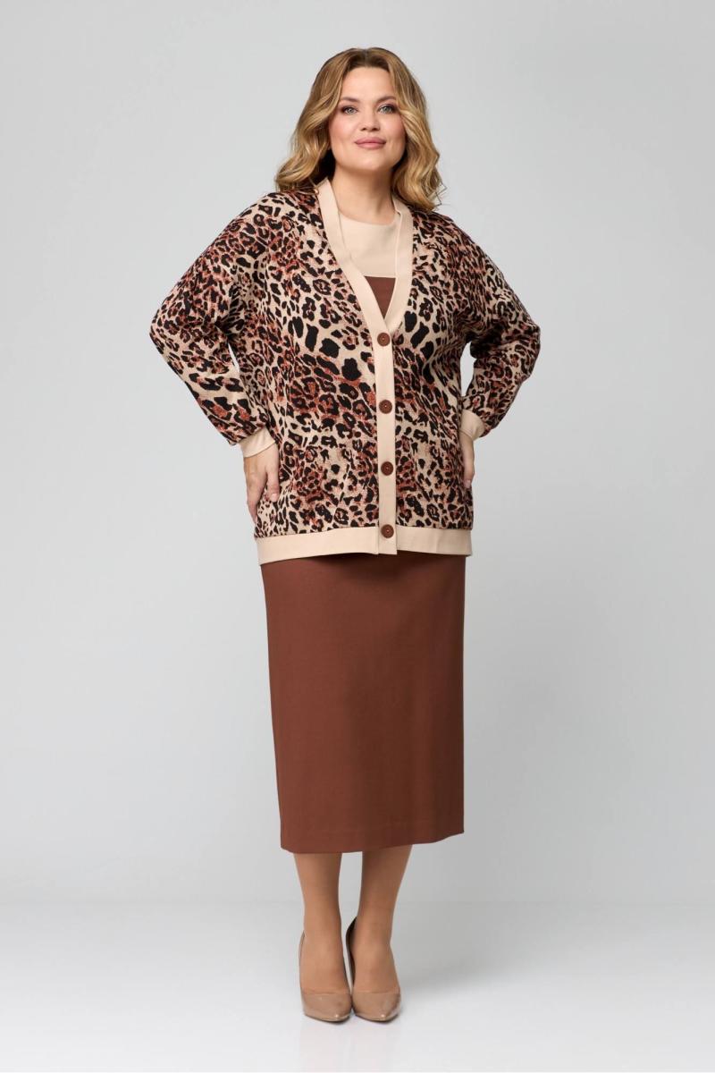 Комплект женский (кардиган и платье). Кардиган женский из трикотажного полотна, прямого силуэта, длиной ниже линии бедер, со спущенной линией плеча, с втачными рукавами, с застежкой на 4 петли и 4 пуговицы. Детали переда кардигана с притачными планками, переходящие по горловине спинки. Рукава втачные одношовные, с притачными манжетами. Платье женское из трикотажного полотна, повседневное, прилегающего силуэта, длиной до середины икр, с втачными рукавами, с застежкой на потайную тесьму-молнию в среднем шве спинки. Деталь переда платья с кокеткой, с нагрудными вытачками. Деталь спинки платья с кокеткой, со средним швом, который заканчивается шлицей, нижняя часть с талиевыми вытачками. Рукава втачные одношовные. Вырез горловины платья округлой формы «под горло». Кардиган: длина спинки – 73см. Платье: длина спинки – 122см. Кардиган: длина рукава - 46см, ширина рукава – 24см. Платье: длина рукава – 58см, ширина рукава – 19см.