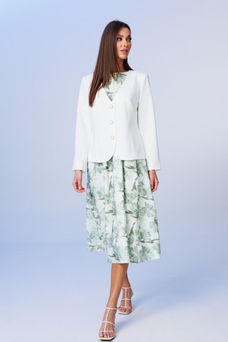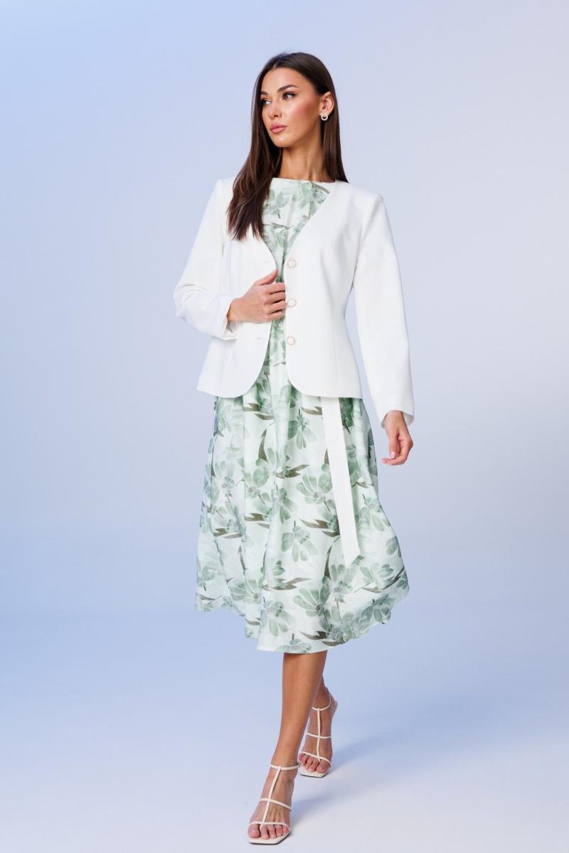 Элегантная пара: полуприлегающий жакет и платье с роскошным принтом и удачной посадкой на фигуре. Платье отрезное по линии талии, округлой горловиной. Полочка состоит из центральной детали и вертикальных рельефных бочков, переходящих в цельнокроеные рукава укороченной длины. Длина рукава по плечевому шву от края горловины 31 см. Спинка с цельнокроеным укороченным рукавом «летучая мышь» имеет средний шов, в котором расположен у горловины разрез с пуговицей-застежкой. Юбка платья А-силуэта, состоящая из цельной детали спереди, сзади: средний шов. В боковых швах платья: внутренние карманы. Лиф платья с юбкой платья соединен швом, в который вставлена эластичная тесьма шириной 1 см. Юбка платья на подкладке. Длина платья по среднему шву спинки 113-115 см (в зависимости от размерного ряда). Длина юбки платья от линии талии 78-82 см. Платье дополнено съемным текстильным поясом на пряжке. Жакет комплекта полуприлегающего силуэта с V-образной формой выреза горловины, на подкладке. Жакет спереди и спинки состоит из притачных рельефных бочков для прилегания силуэта. Застежка фронтальная по борту петли-пуговицы. Длина жакета по спинке 56-58 см (в зависимости от размерного ряда). Рукав двухшовный, длиной 61 см. Представленная фурнитура может отличаться от представленной на фото/видео материале.