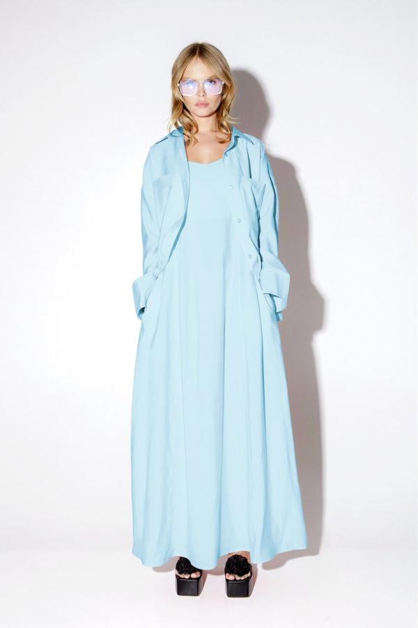 Костюм-двойка из свободной рубашки и макси-платья на бретелях из вискозы. Детали: рубашка прямого силуэта, спущенная линия плеча, накладные карманы, застежка на петли и пуговицы, удлиненные рукава с притачными манжетами. Платье с отрезной завышенной линией талии, рельефные швы, регулируемые бретели, карманы в швах, лиф платья на подкладке. Длина рубашки по спинке около 65 в размерах 40-46 и около 68 см в размерах 48-52, длина рукава+ плечо около 51+11=62 см. Длина платья по боковому шву около 121 см