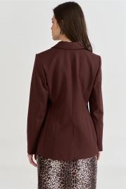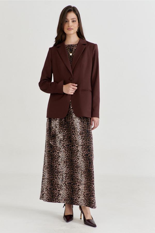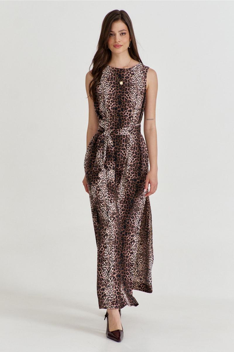 Костюм, состоящий из жакета и платья. Жакет полуприлегающего силуэта, длиной ниже линии бедер. Спинка со средним швом, в котором обработана шлица, с рельефами от пройм до низа. Перед с нагрудной вытачкой, рельефом и прорезным карманом «в рамку». Рукава двушовные, втачные, длинные. Воротник пиджачного типа с лацканом. Застежка на петлю и пуговицу. Жакет на подкладке. Платье свободного кроя, длиной макси. Спинка по горловине с разрезом, в котором обработана застежка на навесную петельку и пришивную пуговицу. По переду нагрудные вытачки. В боковых швах обработаны карманы и высокие разрезы. Горловина округлой формы, без воротника. Платье без рукавов. Платье дополняет съемный пояс.