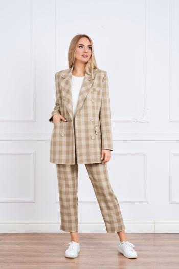 Комплект женский состоит из жакета свободного прямого силуэта и платья. Платье полуприлегающего силуэта с круглой горловиной и с одношовным втачным рукавом, внизу на манжете. Верхняя часть переда с центрально бортовой застежкой на кнопки, нижняя часть с вертикальными вытачками, образующими о-образный силуэт низу, Куртка со спущенным плечом, с одношовным рукавом и втачным воротником на подкройной стойке. Застежка центрально бортовая на пуговицы до линии пергиба лацкана. Перед с накладными рабочими карманами и клапанами.