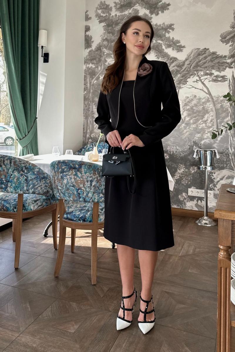 Стильный женский костюм с платьем в черном цвете со съёмным цветком ручной работы. Этот элегантный и модный комплект станет вашим незаменимым помощником в создании неповторимых и запоминающихся образов. Костюм женский 2-х предметный, состоящий из жакета и платья, выполненных из костюмно-плательной ткани.