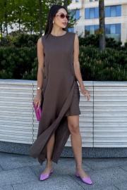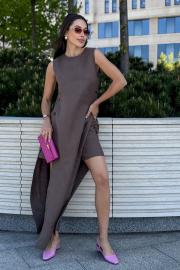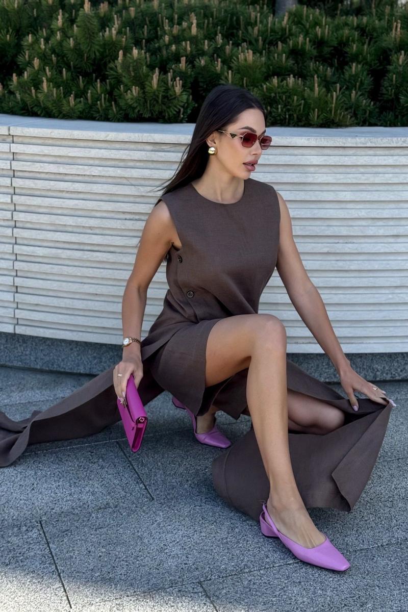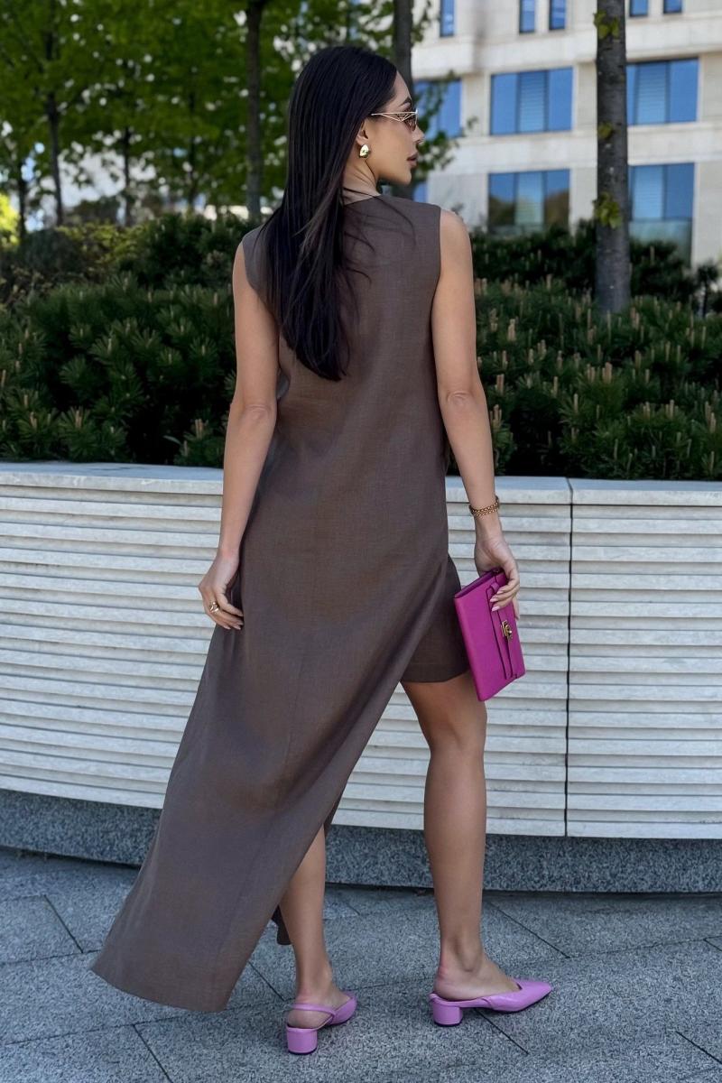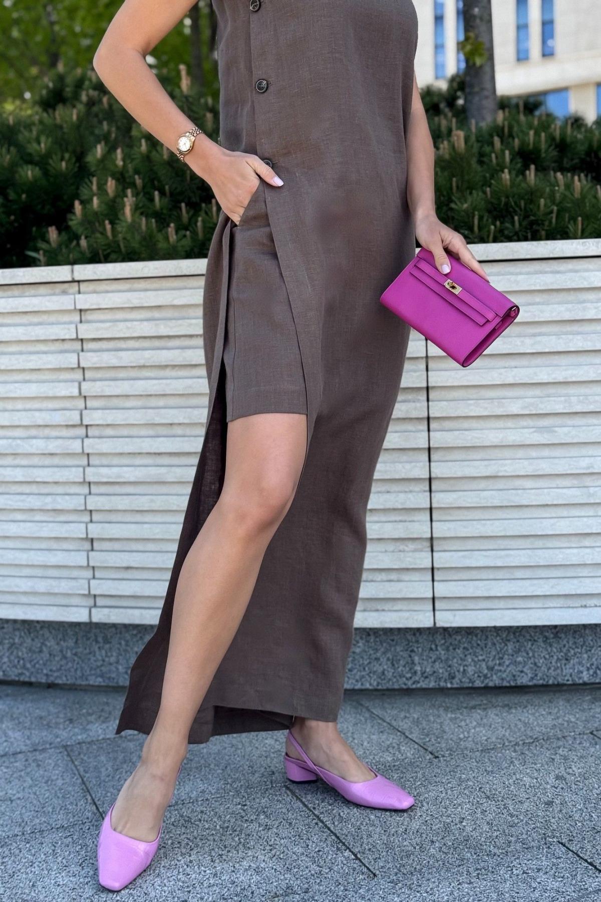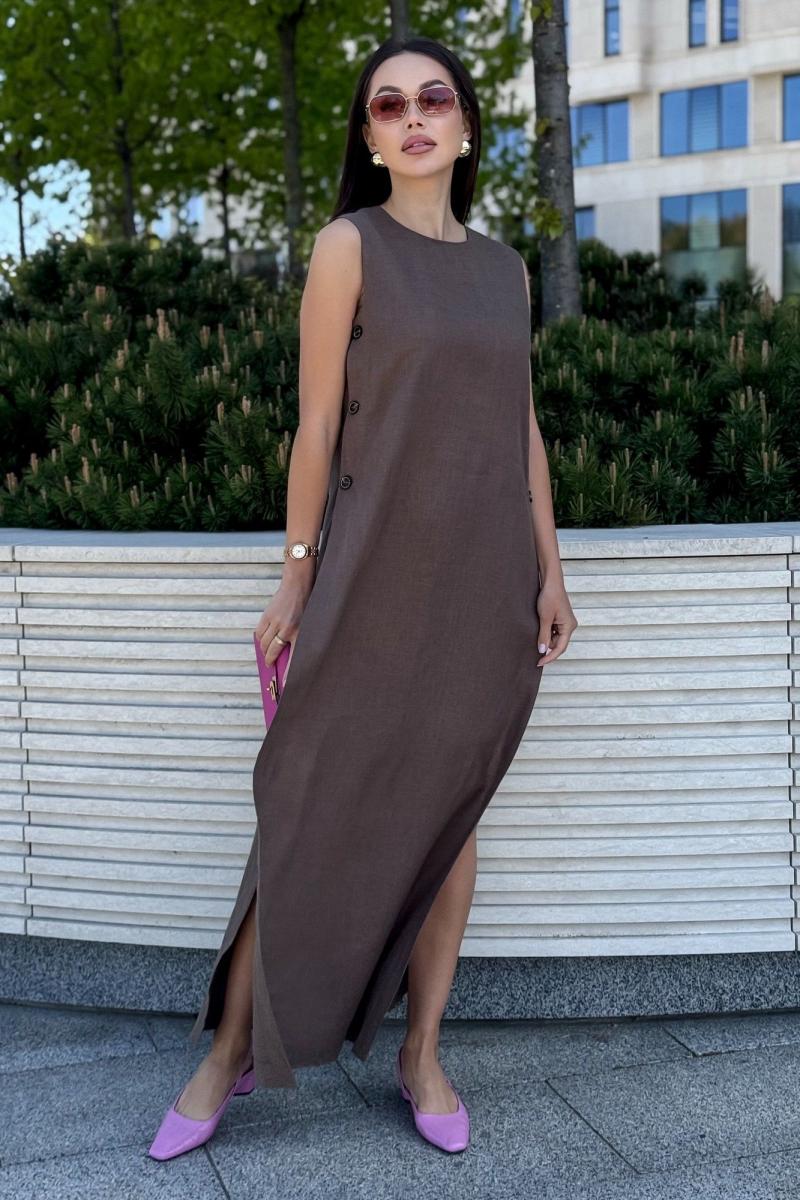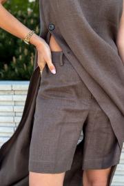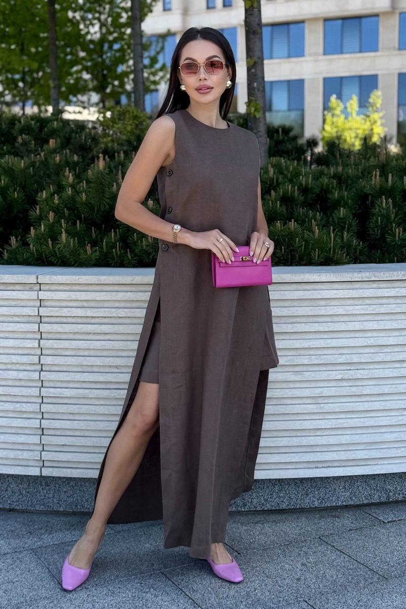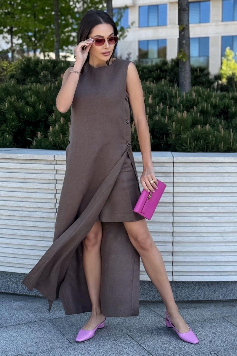 Стильный льняной костюм для женщин — это гармоничное сочетание современного дизайна и натуральных материалов. Комплект состоит из удлинённого сарафана с боковыми разрезами, декорированного пуговицами, и базовых шорт средней длины. Сарафан легко расстёгивается сбоку, создавая модный многослойный силуэт и обеспечивая максимальный комфорт в жаркую погоду. Костюм выполнен из 100% льна — дышащего, экологичного и приятного к телу материала, который идеально подходит для летних прогулок, отпуска или стильных образов в городе. Коричневый цвет подчёркивает натуральность ткани и легко сочетается с яркими акцентами — как, например, с малиновой сумкой или обувью. Костюм женский, двух предметный состоящий из сарафана и шорт, выполненный из костюмно-плательной льняной ткани. Сарафан женский свободного силуэта, без рукавов, в боковых швах с функциональной застежкой с цельнокроеными планками от проймы вниз на 3 петли и 3 пуговицы, переходящей в разрезы до низа, (размер и цвет фурнитуры может незначительно отличаться от фото). Перед без вытачек. Спинка со средним швом, в верхней части с застежкой на потайную тесьму-молнию. Горловина круглая. Проймы и горловина обтачные. Шорты женские, на обтачном поясе, с 5-ю шлевками, с застежкой на тесьму - «молнию», расположенную в среднем шве передних половинок. Пояс застегивается спереди на один пришивной крючок, 1 петлю и потайную пуговицу. Передние половинки с боковыми наклонными карманами. Задние половинки с вытачками.