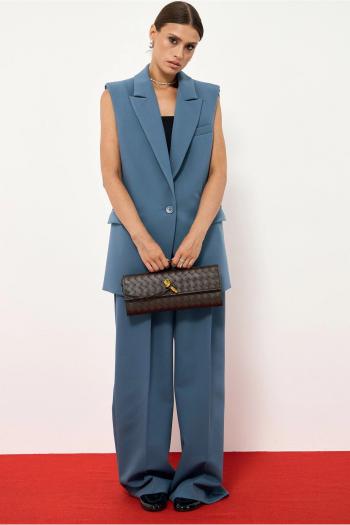 Жакет полуприлегающего силуэта, на подкладке, с двух-бортной застёжкой на петли и пуговицы и внутренней застёжкой на петлю и пуговицу. Перед с рельефными швами, верху с декоративными листочками и отделочными пуговицами. Спинка со средним швом и рельефными швами. Рукава втачные, двухшовные, длинные понизу с притачными отложными манжетами пристёгивающиеся по краям на петли и пуговицы. Воротник пиджачного типа.