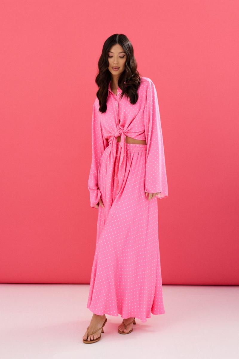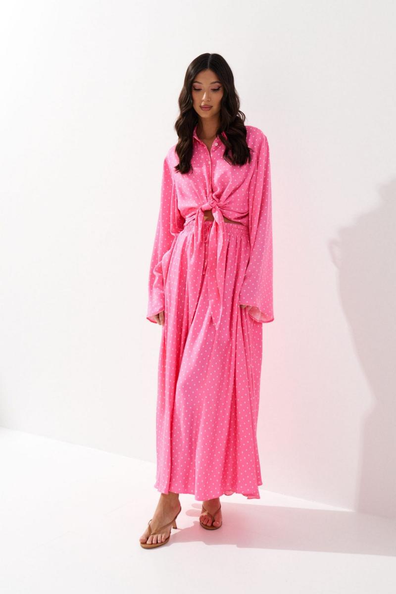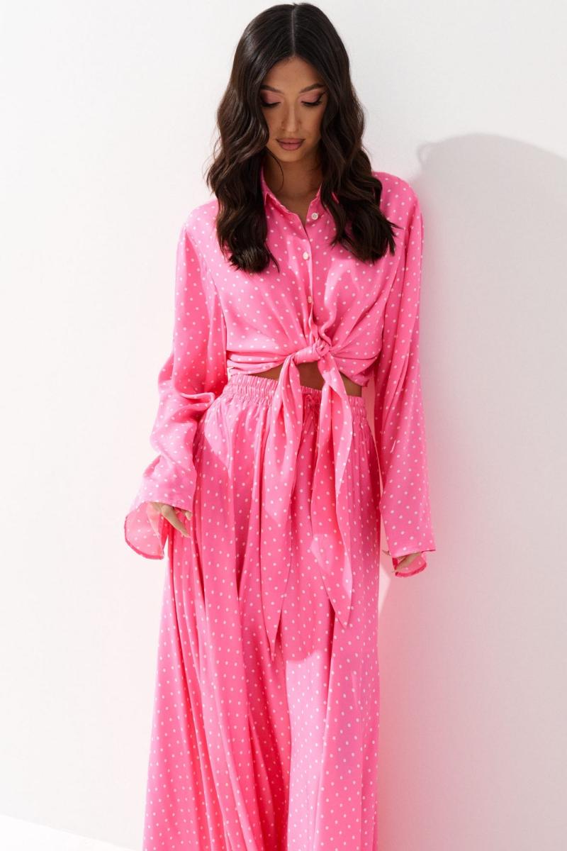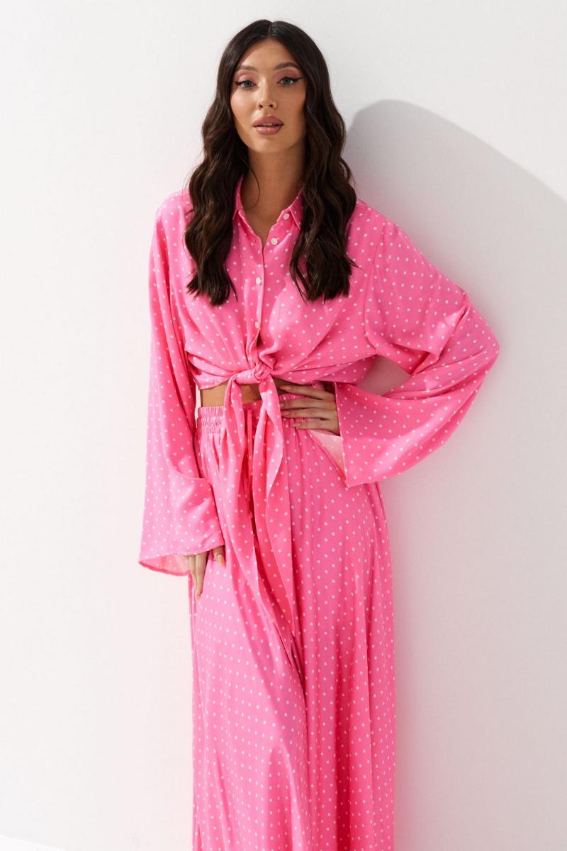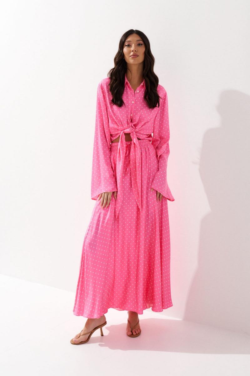 Комплект состоит из рубашки и юбки выполнен из ткани розового цвета с принтом белый горох. Характеристики: рубашка прямой крой, отложной воротник, центральная застежка на петли пуговицы, по переду цельнокроеные удлиненные завязки, рукав втачной свободного кроя. Длина по спинке 42 см, длина рукава 65 см. Юбка свободного кроя, А образного силуэта, подкладка, пояс на широкой резинке с кулиской. Длина юбки 100 см.