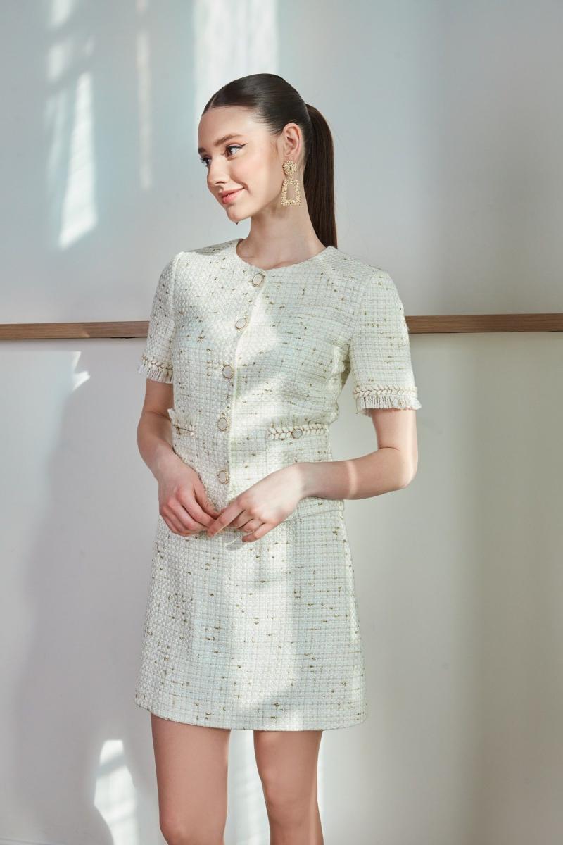 Жакет из мягкой костюмной ткани «рогожка с люрексом» укороченный, длиной ниже талии, полуприлегающего силуэта, с втачными рукавами длиной выше локтя, горловина округлой формы, без воротника. Детали переда с талиевыми вытачками и рельефами из пройм до низа, с настрочными карманами, расположенными на уровне линии талии. Спинка с талиевыми вытачками и средним швом. Застёжка жакета однобортная центральная на петли и пуговицы. Карманы со скруглёнными нижними углами, с отделочной тесьмой «косичка» по верхнему краю и бахромой, по центру верхнего края карманов пришиты пуговицы. Низ рукавов с отделочной тесьмой, настроченной над бахромой. Жакет на подкладке.