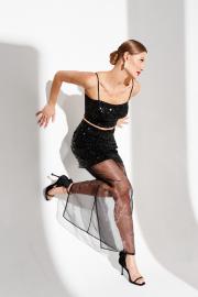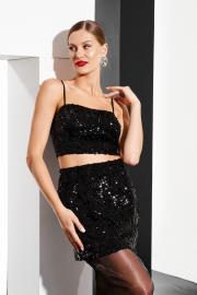 Комплект 2-х предметный (блузка+юбка). Блузка женская, укороченая, приталеного силуэта, длиной чуть выше линии талии, корсетного типа . Перед разрезной. Спинка с рельефами, в среднем шве спинки застежка на декоративную разъемную молнию. Блузка на регулируемых бретелях и подкладке. Юбка женская, прямая, двойная. Верхняя юбка длиной выше линии колен из пайеточной ткани. Нижняя из органзы, по спинке с разрезом.