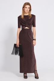 Комплект: блузка + юбка. Комплект выполнен из трикотажного полотна с люрексом. Блузка приталенного силуэта длиной до линии талии. Спереди средний шов с застежкой на потайную молнию, перекрут со сборками по боковыми швам. Спинка цельная. Рукав втачной одношовный, длиной до линии локтя. Блузка с плечевыми накладками, на подкладке. Юбка длиной макси, зауженная к низу. Переднее и заднее полотнища цельные. В левом боковом шве разрез. Юбка на цельнокроеном поясе. Юбка без подкладки.