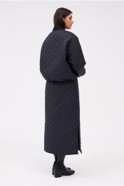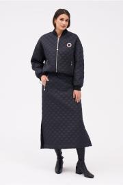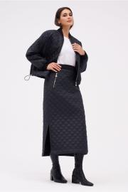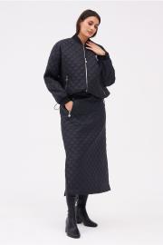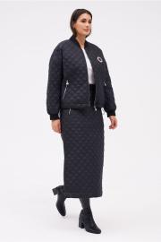 Комплект из стёганной плащёвки состоящий из бомбера и юбки миди. Бомбер с трикотажной стойкой по горловине и манжетами. По низу на кулисе со шнуром и фиксаторами. Спереди два кармана и застёжка на металлическую молнию. На груди слева настрочен декоративный шеврон. Юбка на трикотажном поясе с карманами по переду и застёжкой на потайную молнию сбоку. Снизу по бокам разрезы.