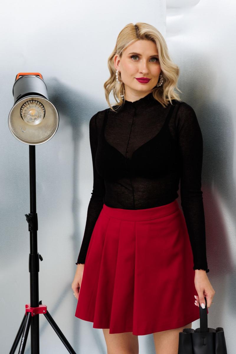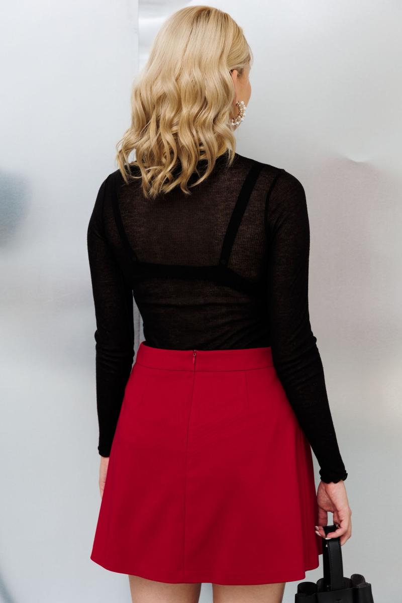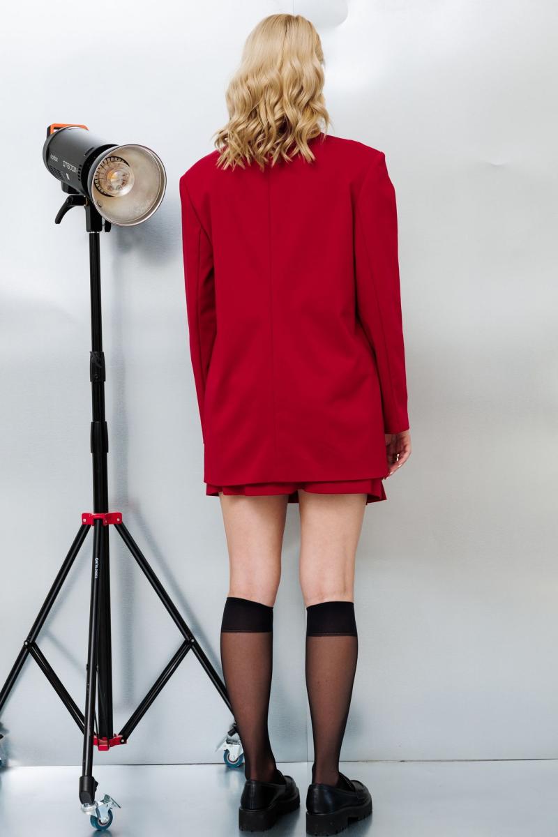 Комплект с мини юбкой, состоит из жакета оверсайз и юбки в складки. Жакет свободного кроя, на подкладке. по переду расположены накладные карманы. Застежка центральная на пуговицу. Юбка в складки. По переду расположены ассиметричные складки. Застежка на потайную молнию.
