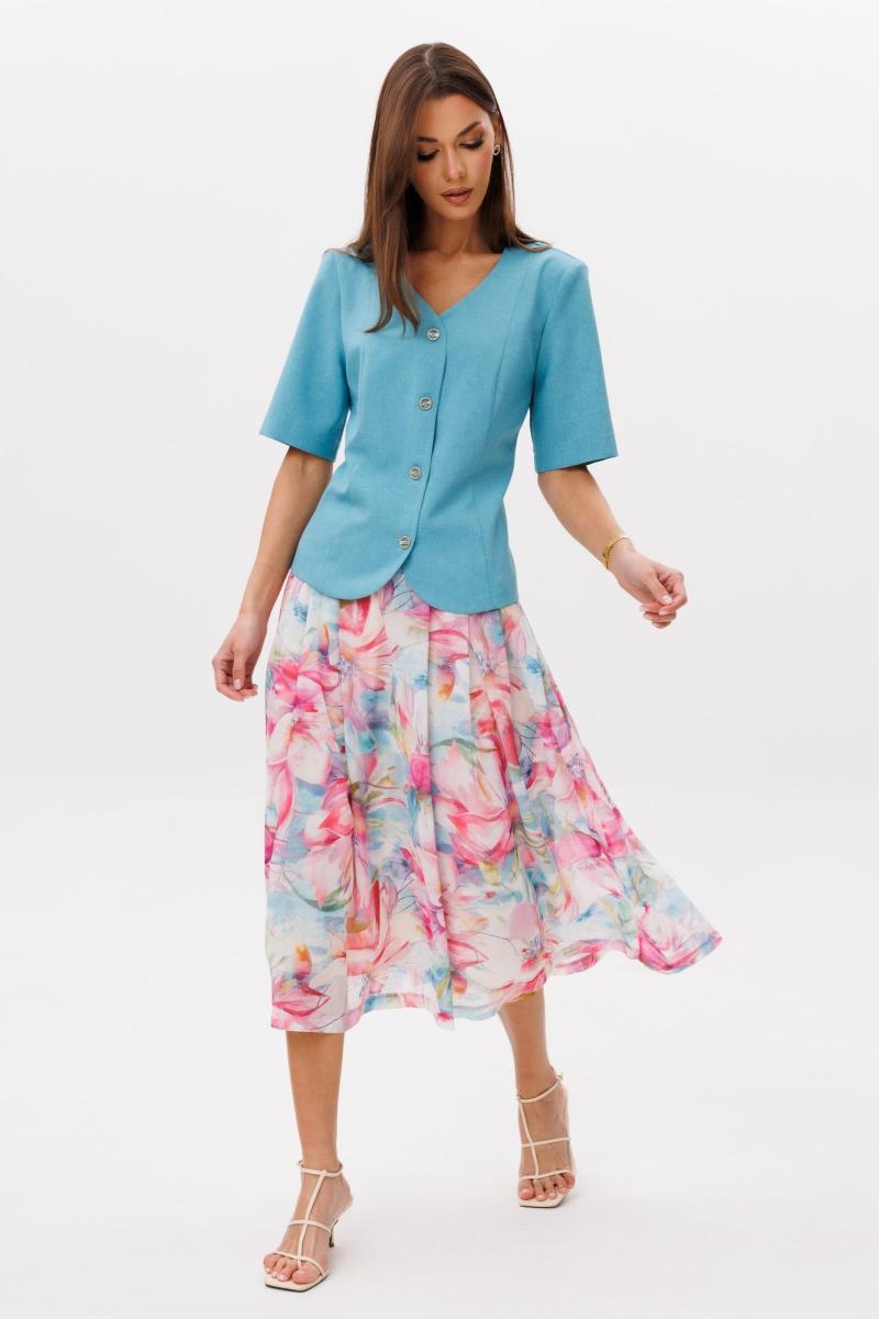 Элегантный комплект: полуприлегающий жакет с коротким рукавом и актуальной юбкой со складками. Жакет-блузон без подкладки полуприлегающего силуэта с вертикальными рельефами для прилегания по спинке и полочке. Срезы горловины и низ бортов оформлены угловым вырезом без воротника и закругленными бортами. Рукав-втачной, одношовный, укороченной длины. По центру изделия по борту расположена застежка на петли/пуговицы. Длина изделия по спинке: 54-56 см (в зависимости от размера). Юбка комплекта на подкладке, состоит из нескольких полотнищ со складками в разных направлениях. Глубина складок 4-6,5 см. В среднем шве спинки размещена потайная молния. Пояс притачной, высотой 4 см со вставленной эластичной тесьмой (резинка). Фиксируется сзади на застежку петля/пуговица. Длина юбки не считая притачного пояса 77 см. (Представленная фурнитура может отличаться от представленной на фото/видео материале) Особые рекомендации: рекомендуется холодная деликатная ручная стирка, без использования отбеливающих СМС, без интенсивного трения. Сушка в вертикальном положении. ВТО с минимальным паром.