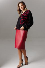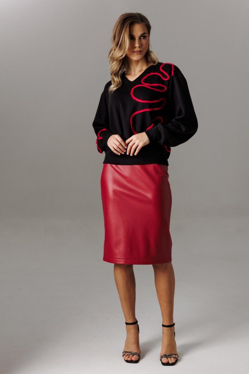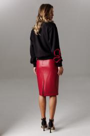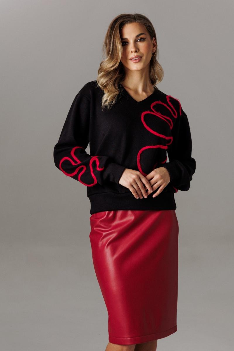 Блузон свободного прямого силуэта, с декоративной отделкой из контрастного шнура. Линия плеча чуть спущена, рукав прямой на зауженной манжете. Длина рукава вместе с плечевой линией 78 см. Из них 13 см: длина плеча и 65 см: длина рукава с напуском. Высота манжета 8 см. Декоративным элементом блузона выступает: контрастный рисунок, напоминающий элементы лепестков цветочного узора. Расположены эти элементы асимметрично: на одном из рукавов, также полочке и частично в боковом сегменте спинки блузона. Рисунок создан трикотажным кантом. Горловина оформлена угловым вырезом на полочке и оформлена притачным обтачным элементом. Низ блузона оканчивается притачной манжетой, высотой 7,5 см. Длина блузона по спинке изделия 61 см. Юбка из имитированной кожи, облегающая, зауженная к низу. В среднем шве заднего полотнища юбки расположена потайная застежка-молния и открытый разрез 20 см. На линии талии расположены вытачки. Пояс обработан обтачкой. Длина юбки по боковому шву 62 см.
