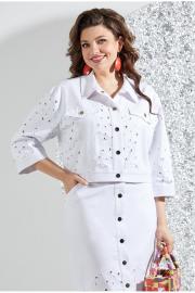 Джинсовый комплект, состоит из юбки и куртки, выполнен из однотонного джинса и джинса с рваным эффектом. Джинсовая куртка выполнена в классическом стиле трендовых джинсовок. Горловина обработана втачным воротником, застежка по переду на планку с пуговицами. На полочке выполнена кокетка из однотонного джинса, рельефы и клапан из джинса с рваным эффектом, по низу планка из однотонного джинса. Спинка также с кокеткой из однотонного джинса, нижняя часть спинки из джинса с рваным эффектом. Рукав втачной, длиной 3/4, выполнен из джинса с рваным эффектом, по низу на манжете из однотонного джинса. Юбка с застежкой по переду на планку с пуговицами, верхний срез обработан притачным поясом, в боковых швах карманы. Нижняя часть юбки выполнена из джинса с рваным эффектом, заднее полотнище юбки идентично переду, также обработана кокетка с прорезными карманами с листочкой. Эффектный и супер-трендовый комплект может сочетаться с другими вещами вашего гардероба! Это отличный вариант, который никогда не выходит из моды!