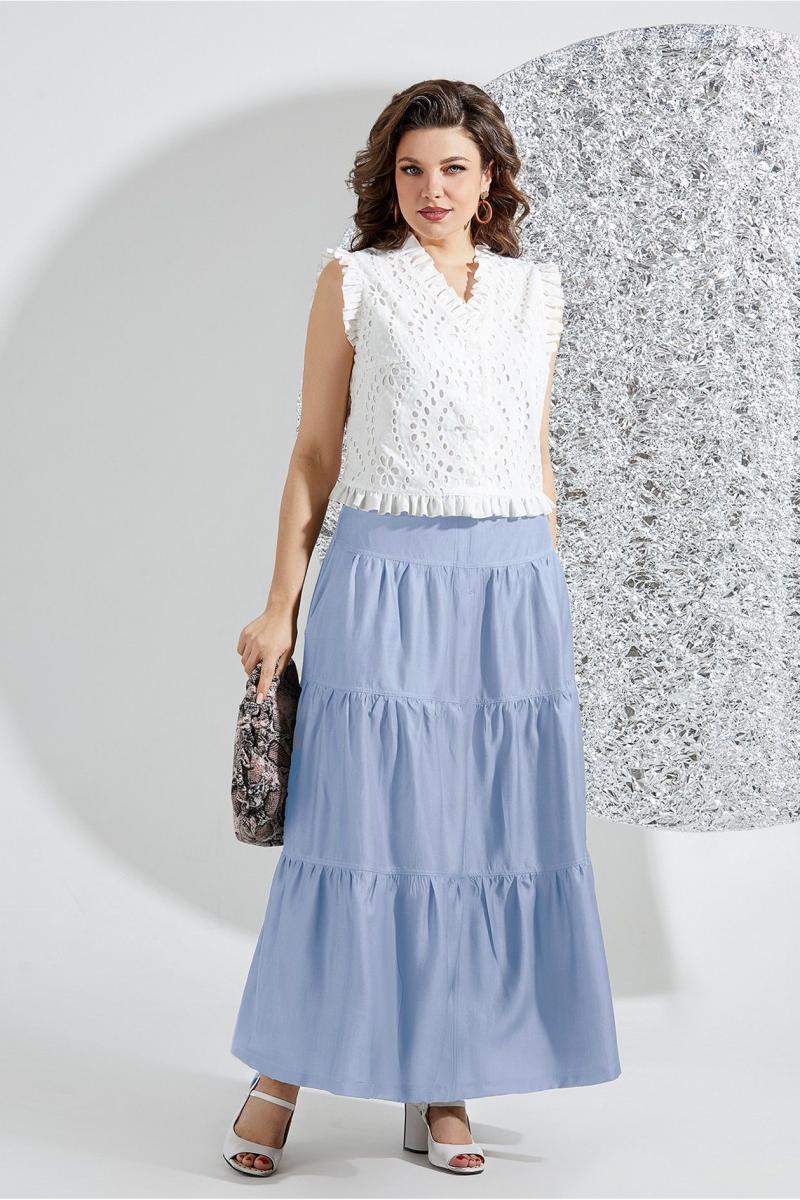 Летний комплект, состоит из блузки, выполненной из хлопкового шитья и юбки, выполненной из тонкого джинса с переливом. Блузка выполнена из хлопкового шитья, по переду на х/б подкладке. По полочке на застежку петли-пуговицы, горловина V-образной формы, декорирована рюшей из однотонного хлопка. Спинка со средним швом и вытачками, из хлопкового шитья. По пройме и низу блузы притачной, присборенный волан из однотонного хлопка. Юбка расклешенная, верхний срез обработан притачным поясом, застежка по переду на молнию. Юбка состоит из трех присборенных воланов, по середине отстрочен шов, также по бокам, на полочке обработаны карманы. Стильный комплект, который может отлично сочетаться и с другими вещами вашего гардероба, отличный выбор!