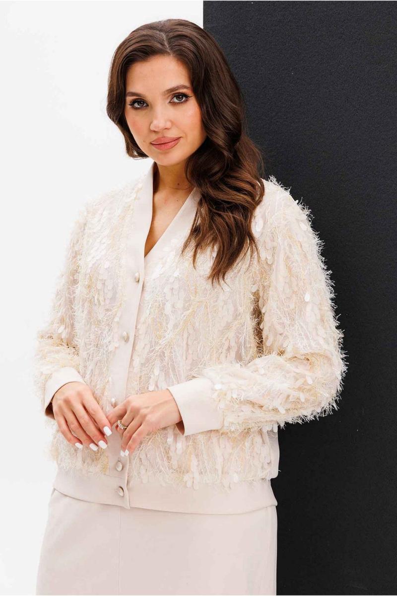Костюм женский, состоящий из жакета на трикотажной подкладки и юбки. Юбка на притачном поясе с резинкой, с разрезом по переду и боковыми карманами. Юбка прямого силуэта, на трикотажной подкладке. Жакет с притачной планкой по борту, с центральной застежкой на петли-пуговицы. Плечо спущенное, рукав втачной, с манжетой. Полочки и рукава из отделочной ткани.