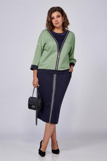 Костюм женский, состоящий из блузы и юбки. Блуза свободного кроя. Перед с нагрудными вытачками. Рукава втачные, одношовные. По боковым швам обработаны разрезы. Юбка прямого силуэта, с рельефами по переду, заканчивающимися шлицами. По бокам переда обработаны карманы. Спинка со ср. швом и застежкой на тесьму-молнию. По бокам юбки настрочена отделочная тесьма. Юбка на подкладке. Верх обработан притачным поясом.