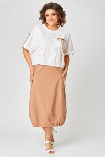 Комплект женский состоит из блузы и юбки. Блуза со спущенными плечами. По переду и спинке горизонтальные кулисы. Горловина V-образная. По бокам небольшие разрезы. Юбка, слегка расклешённая к низу, на обтачке, без подкладки. По переду рельефы от талии до низа, заканчивающиеся шлицами с разрезом. По заднему полотнищу юбки талевые вытачки, центральный шов и застёжкой на потайную тесьму-молнию.